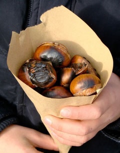 ;À quatre-vingts milles du côté du noroît, l’homme arrive à la ville d’Euphémie, où convergent à chaque solstice et chaque équinoxe les marchands de sept nations. La barque qui y accoste avec un chargement de gingembre et de coton appareillera la cale pleine de pistaches et de grains de pavots, et la caravane à peine déchargés ses sacs de noix de muscade et de raisin sec bourre déjà pour le retour ses bâts de rouleaux de mousseline dorée. Mais ce qui pousse à remonter les fleuves et traverser les déserts pour venir jusqu’ici, ce n’est pas seulement l’échange de marchandises que tu retrouves partout dans tous les bazars de l’empire du Grand Khan et au-dehors, mises en vrac à tes pieds sur les mêmes nattes jaunes, à l’ombre des mêmes rideaux chasse-mouches, offertes avec les mêmes soi-disant rabais. Ce n’est pas seulement pour vendre et pour acheter qu’on vient à Euphémie, mais aussi parce que la nuit, auprès des feux allumés tout autour du marché, assis sur des sacs ou sur des tonneaux ou bien étendus sur des piles de tapis, à chaque mot que l’on prononce – comme « loup », « sœur », « trésor caché », « bataille », « gale », « amants »– chacun raconte sa propre histoire de loups, de sœurs, de trésors, de gale, d’amants, de batailles. Et tu sais que durant le long voyage qui t’attend, quand, pour rester éveillé bercé par le chameau ou la jonque, tu te mets à faire défiler tes souvenirs personnels l’un après l’autre, ton loup sera devenu un autre loup, ta sœur une sœur différente, ta bataille d’autres batailles, en revenant d’Euphémie, la ville où s’échange la mémoire aux solstices et aux équinoxes. » Extrait de Les villes invisibles, Calvino, Italo ce qui aussitôt me fait penser au mot châtaigne. Depuis combien d’années ne suis-je pas allé en ramasser. Je crois que la dernière fois c’était il y a plus de dix ans, dans le Beaujolais, à Ville-sur-Jarnioux. A moins que ce ne fut des noix... oui tout compte fait c’était des noix, nous en avions récolté un sacré paquet pour faire du vin. Mais alors les châtaignes... quand ? Je me souviens en avoir acheté un cornet l’hiver 1982 au marché aux puces de la Porte de Clignancourt. Succulentes dans mon souvenir d’autant qu’à cette époque je devais être seul, que j’ai du m’enfiler le cornet tout entier. Chose qui dans mon souvenir ne s’est plus jamais reproduite par la suite. Soit je ne tombais sur aucun marchand de marrons chauds- tiens des marrons maintenant- soit je n’étais pas seul et j’ai oublié les autres cornets. À Lyon je n’ai jamais acheté de marrons chauds. C’était plutôt des pralines grillées... mais jamais seul, avec les enfants certainement. Mais où donc ai-je ramassé mes dernières châtaignes… probablement dans les bois qui entourent le château de Fremont, dans l’Allier. C’était chasse gardée évidemment mais justement elles avaient ce petit goût particulier de l’interdît, comme les ceps, les bolets les girolles que l’on récoltait abondamment entre septembre et octobre, parfois même début novembre. On partait tous les deux ma mère et moi. En mobylette, une bleue comme on disait. S’enfoncer dans les bois avec la trouille d’être aperçus par le garde champêtre ou le seigneur présumé des lieux. Châtaigne c’est aussi le nom d’un coup de poing, je vais te flanquer une châtaigne. Mon père disait des choses comme ça, comme les hommes alentour en général ou encore un marron. Ceci expliquant cela.|couper{180}