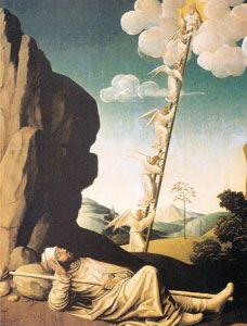 Un autre symbole qui vient à l’esprit presque aussitôt est celui de l’échelle de Jacob. Pourquoi les anges emprunteraient-ils une échelle alors qu’ils ont des ailes pour monter et descendre ? L’échelle est une réalité physique dans ce cas que l’on doit gravir ou descendre en opposition au fantasme de vol comme à celui de toute chute. L’échelle est aussi la matérialisation du lieu comme du chemin qui traverse tous les lieux.