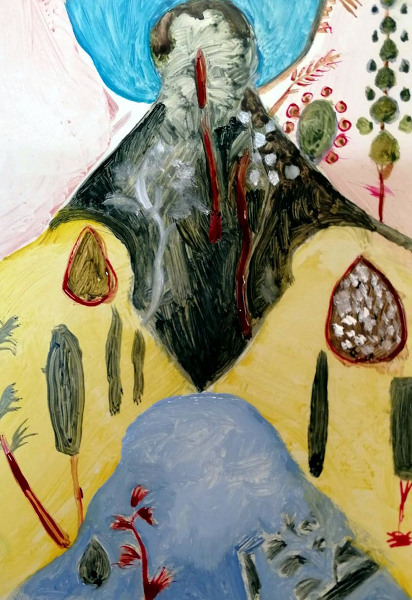 Il avait longtemps tourné autour de ces mots-là : « beau », « déco », comme si la peinture se décidait dans un débat. Puis il avait laissé tomber. Il avait refait le chemin jusqu’au pont : la toile nue, la main d’enfant qui hésite au bord du pinceau. Ce qui le mettait en route, maintenant, ce n’était plus l’idée brillante ni la fulgurance, mais l’écoute. Le cœur qui bat, le sang qui circule, le feulement d’un chat en quête sur le toit voisin, le petit ploc d’une goutte d’eau : ces signes minuscules lui donnaient une direction plus sûre que ses images d’autrefois, celles où il se perdait en croyant avancer. Il sentait qu’il pourrait presque peindre les yeux fermés, non par virtuosité, mais parce que quelque chose en lui avait cessé de forcer. Son œil aussi avait changé : un trait trop fragile, une couleur trop vive le faisait vaciller, alors il allait plus loin dans la concentration, sans juger, et laissait la main faire ce qu’elle savait faire quand elle n’était pas surveillée. Quand il recula enfin de quelques pas, comme il le faisait toujours pour voir, il fut arrêté net. Le tableau tenait. Il était beau au sens le plus simple : comme un olivier bien taillé, traversable, respirant. Un oiseau aurait pu y passer sans se cogner. Il se sentit passeur, c’est-à-dire capable de laisser passer quelque chose sans le déformer. La beauté était là, dans cette fragilité acceptée, dans cette souplesse trouvée pour la laisser sourdre et la partager. Demain, sans doute, il faudrait recommencer. Mais ce jour-là, c’était arrivé. illustration huile sur toile pb 2019|couper{180}