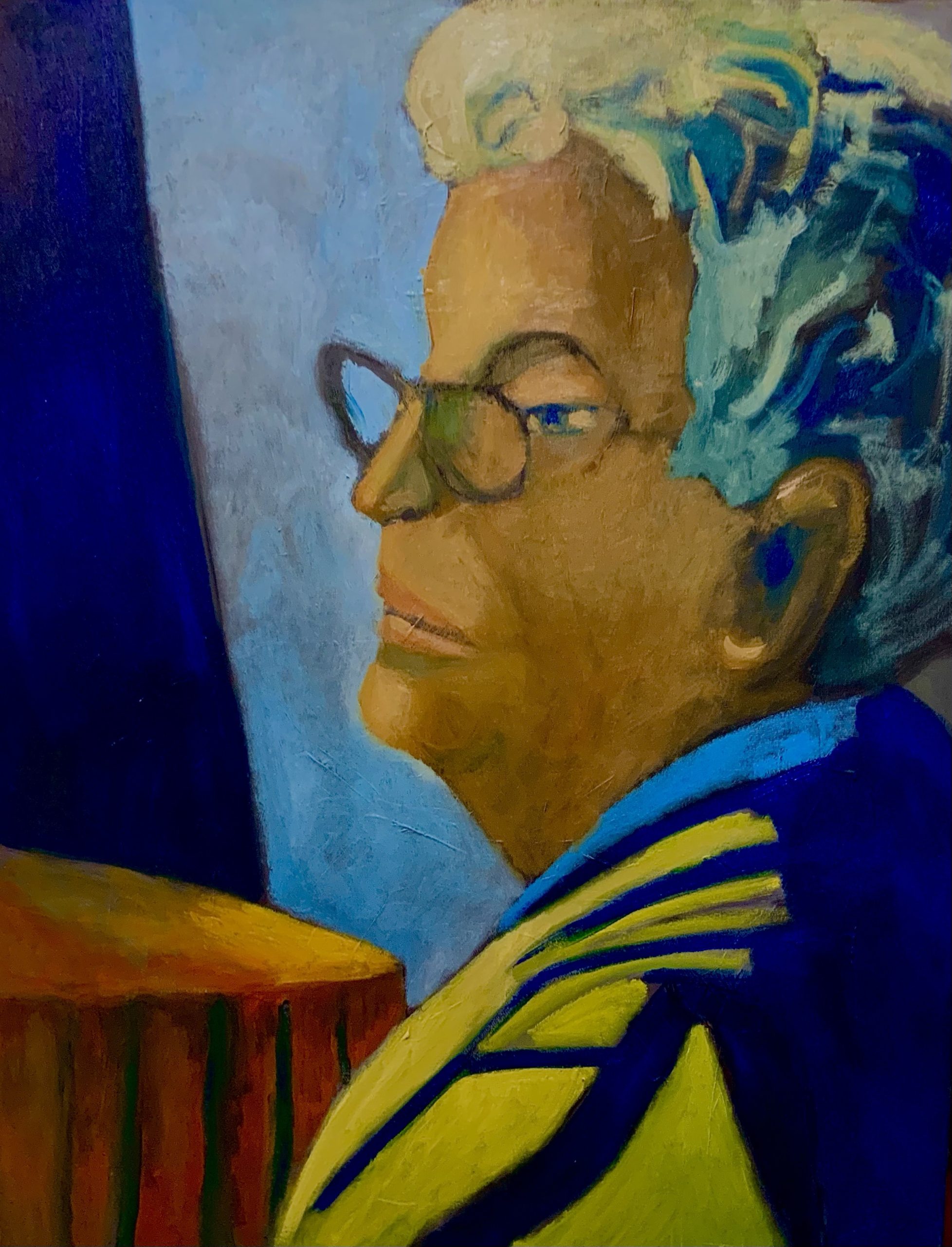 Les règles existent, même si de moins en moins de personnes s’en soucient, ou passent le plus clair de leur temps à les contourner par profit, par intérêt égoïste. En peinture aussi il y a quelques règles. On peut parfois les remette en question, ne pas les appliquer bêtement. Ainsi cette règle de ne pas appliquer directement sur la toile la couleur qui sort du tube. une règle que j’applique bêtement depuis des années. Je cherchais une ombre qui ne soit pas bouchée sur un tableau que je reprends presque 40 ans après… une toile que m’avait inspiré le souvenir de ma grand-mère maternelle. De mémoire, sans photographie. C’est d’ailleurs un stage que je propose parfois. Peindre un membre de sa famille, un proche, de mémoire uniquement. Bref. J’avais ce tube de bleu de céruléum, je l’ai pressé et j’ai directement pioché dans la couleur pure pour la placer sur les ombres de la toile. Je travaille toujours sans aucun médium avec mon petit pinceau ce qui m’oblige à prendre le temps, à tirer la peinture mais pas trop, il faut souvent recharger le pinceau. Et la soudain, l’émotion provoquée par la beauté du bleu pur sur les couches antérieures noires. J’ai pensé à Matisse, c’est dans mon esprit la même émotion que j’avais éprouvée en regardant ses toiles, le bleu de la danse notamment. Le jaune est venu ensuite, le contraste du jaune et du bleu. J’ai juste ajouté un peu de blanc dans le jaune pour qu’il n’envahisse pas toute la toile.