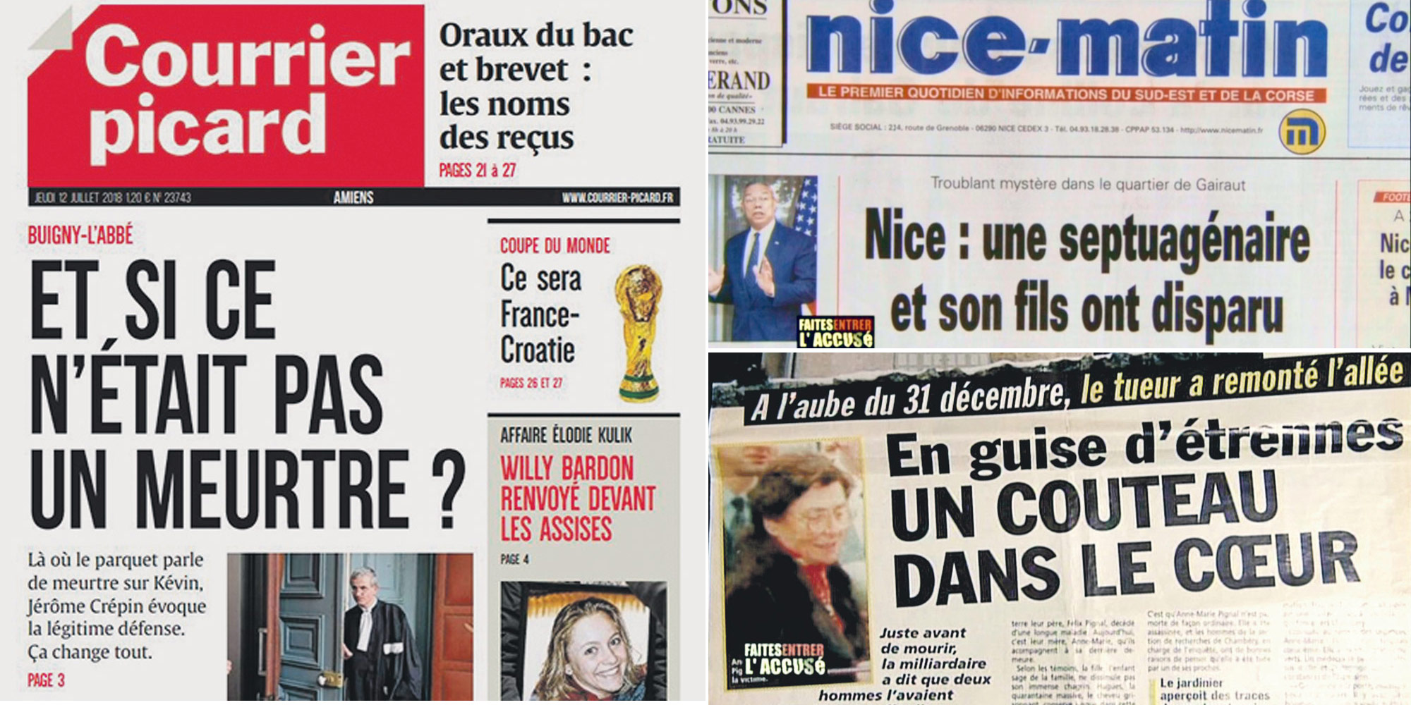 Une affaire de famille sordide/ un monstre rôde la psychose s’installe/ drame à Nîmes : l’assassin est de la famille / la patronne de cette auberge tuait et humiliait ses clients/ une double vie accablante / la découverte glaçante qui fait trembler l’Ariège/ une fête qui tourne mal / elle manipule son amant pour tuer son mari / scène macabre dans une papeterie/ crime d’honneur : il perd tout pour venger sa fille