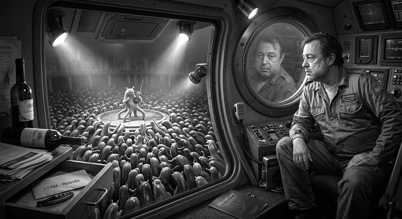 Ce matin — Nimbus Pro 4000, café terrien, hublot, bajoues — j’ai ouvert le tiroir entre le tire-bouchon et les relevés de la CPAM. La brochure DivinCorp était là. Nous fournissons à vos civilisations émergentes l’encadrement divin qu’elles méritent.