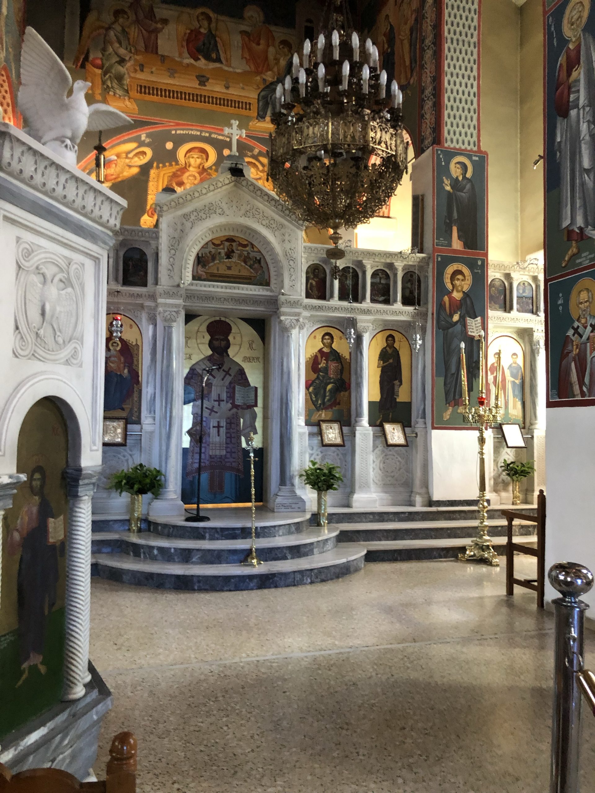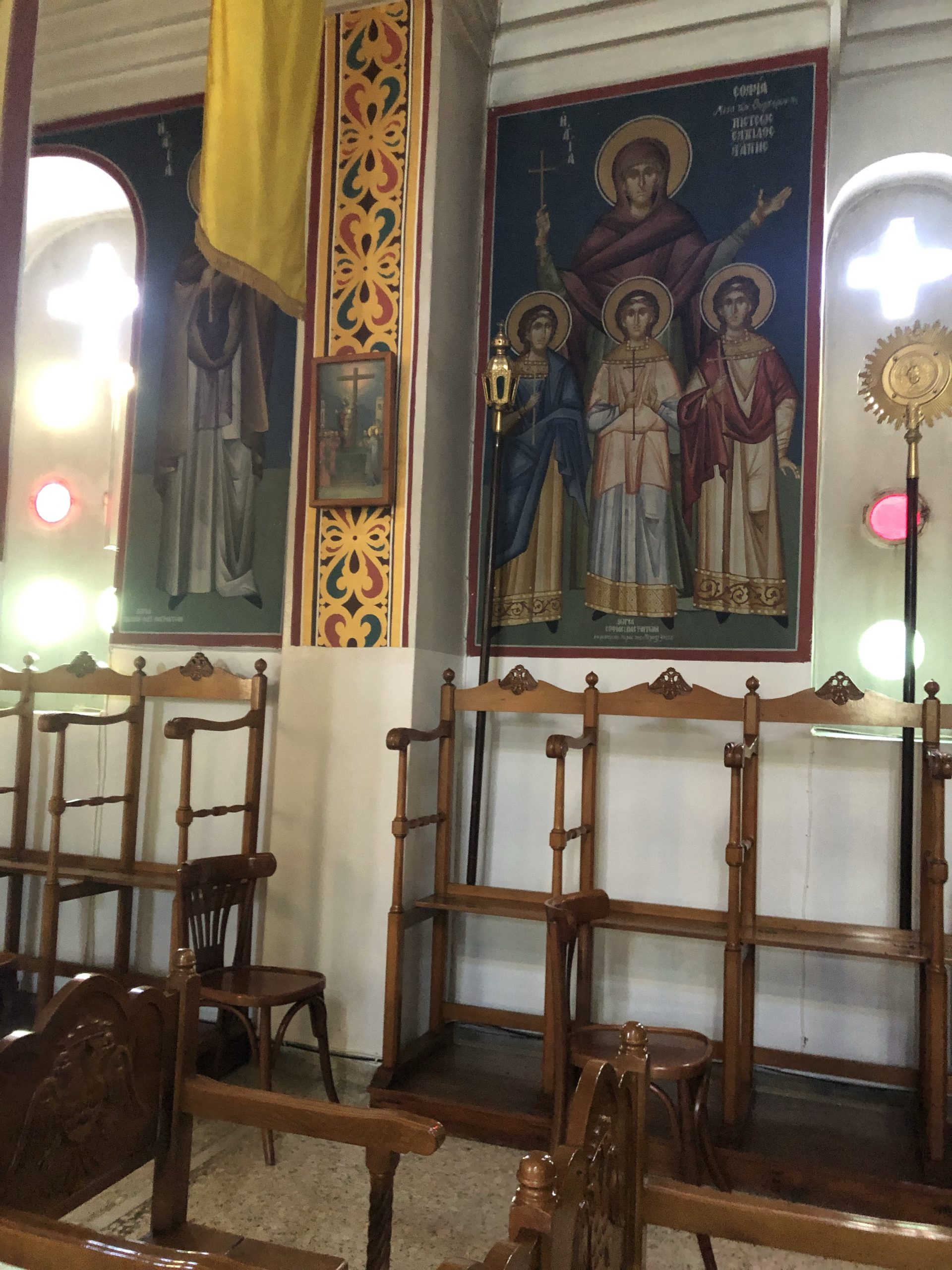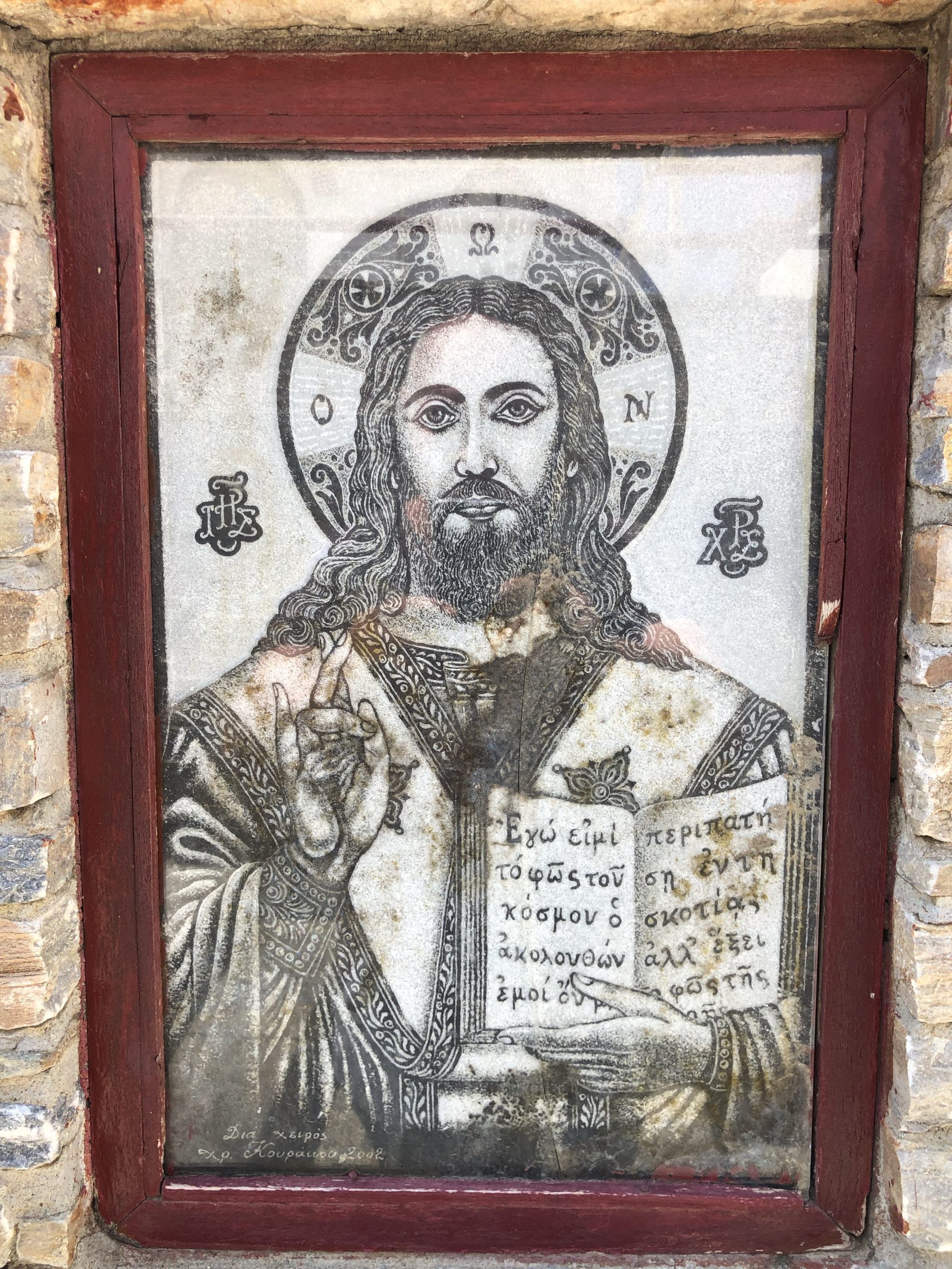 Visite de l’église orthodoxe de Batsi. Mon Dieu toutes ces peintures de personnages. De parfaits inconnus pour moi. Cela m’a fait penser aux vies minuscules de Pierre Michon. Et aussi à tous ces saints qui apparaissent dans la Légende Dorée de Jacques de Voragine. Le lien quel est-il. Une efficacité simple pour témoigner du passage d’un être humain. Que ce soit au fin fond de la Creuse, ou bien dans les arènes de Rome, n’a pas d’importance. On extraie une substance. Une brièveté et une efficacité pour dire l’essentiel de l’homme, du paysan, du martyr, et du saint. Sans chichi et sans artifice qui, par la digression, trahirait le but simple de témoigner de ce passage. Et puis ensuite on peut penser évidemment à une vie décrite par Flaubert dans un coeur simple. Et on voit tout de suite l’hérésie dans le perroquet empaillé en fin de partie.