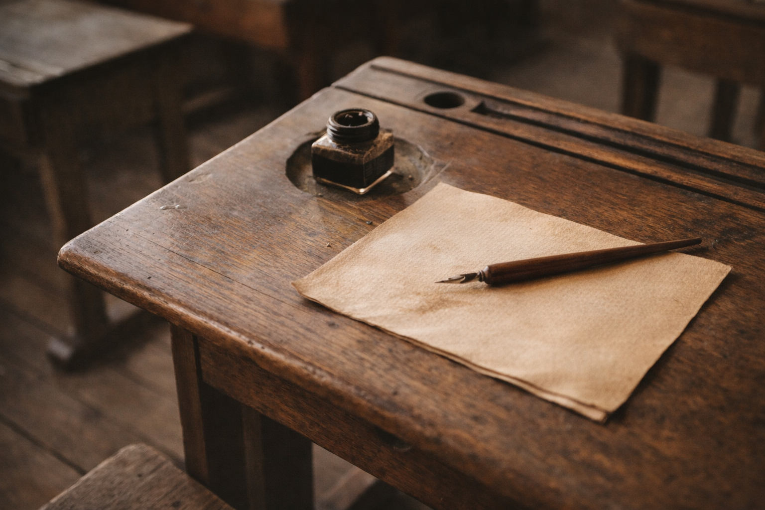 Un pupitre à plan légèrement incliné, avec dessous une case où ranger les livres, les cahiers. Il y a, dans un angle, un encrier de porcelaine blanche, et aussi une rainure un peu plus loin sur le plan de travail pour placer un porte-plume. Il faut tendre un peu le bras pour attraper le manche, attendre que l’encrier soit rempli d’encre, la plupart du temps violette, vérifier la propreté de la plume sergent-major. Les neuves sont souvent les plus décourageantes car trop rigides, trop rêches, contraires à la volonté naissante de la main de dessiner des lettres. Une fois la plume un peu usée, c’est en revanche une sinécure. Dessiner des lettres selon l’appellation en vigueur, anglaise, avec des pleins et des déliés. Ne pas oublier de tirer un peu la langue sur le côté de la bouche, comme si la langue servait de gouvernail à la main pour bien écrire. La case est toujours en désordre. On y trouve à tâtons différentes matières : la croûte du pain, la peau lisse d’une pomme, les bosses d’une ou deux châtaignes, voire même la surface molle et fondante d’un carré de chocolat noir posé à même le contreplaqué du socle. Lancer une main à la quête du contenu de la case, c’est mettre la main dans la Bocca della Verità ; si on la retrouve indemne, on est soulagé. Et surtout, ensuite, apporter à la bouche la trouvaille sans être vu : voilà la prouesse. Sinon, gare : on prendra un coup de règle en bois sur le bout des doigts, ou bien on ira au coin, bonnet d’âne, on sera montré du doigt comme gougnafier, on devra copier cent fois, à la plume et à l’encre violette, sans pâté : « Je ne dois pas manger en classe. »