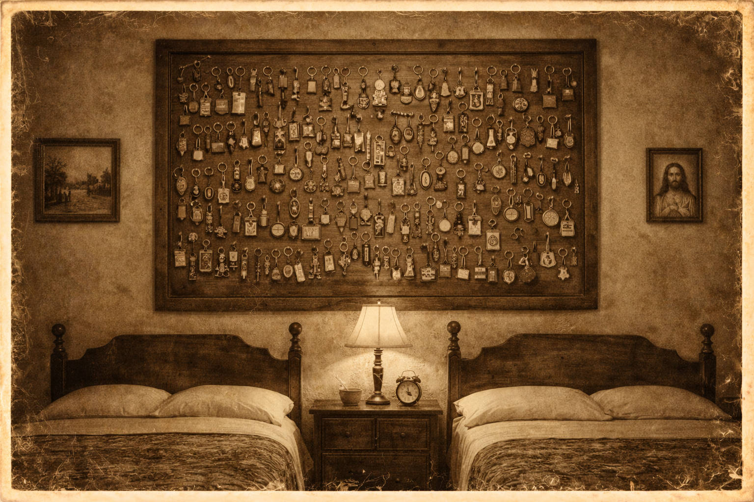 Ce que dit la chambre de nous, de moi, mieux vaudrait l’ignorer activement, si on le peut — ou tout le contraire. Ce n’est pas un rectangle, pas un carré, pas un cercle : c’est un polygone. Si l’on suit la plinthe, celle-ci se brise en segments consécutifs, avec, à chaque changement de direction, des angles plus ou moins aigus ou obtus. Un grand lit, placé au milieu d’un mur car on ne pouvait pas le placer dans un coin : aucun coin convenable ne pouvant l’accueillir. Un lit comme à la campagne, avec une large tête de lit, un pied de lit, des draps rugueux, un édredon épais. Sur un autre pan de mur, une armoire à glace qui déforme l’image quand on cherche à s’y voir. Avec, tout en haut, au-dessus d’une corniche, la silhouette d’une panthère noire en plâtre dont la moitié de la tête est brisée, laissant apparaître une tache blanche dans la pénombre. Le soir, des lueurs courent sur les murs, accompagnées par le grondement des moteurs, des coups de klaxons. En pleine nuit, le ronflement puissant d’un homme qui dort près d’un enfant qui veille, terrorisé par les hurlements lugubres d’une folle, au même étage de l’immeuble d’en face. Elle s’agrippe à une rambarde de fer sous un déferlement d’arabesques de style Art déco, en pleine tempête, de l’autre côté de la rue. La collection de porte-clés est accrochée au mur vert pâle de la chambre. C’est un ensemble qui tape dans l’œil, une sorte de tout qui surgit, qui s’impose par la quantité : le nombre, ou plutôt l’innombrable. Il doit y avoir plus de cent porte-clés. Chacun témoigne d’une époque traversée, d’un paysage constitué de forêts problématiques, de steppes immenses, de gouffres insondables, de pics inaccessibles. Un paysage où le Grand Organisme à Mille Têtes de la Consommation des Objets félicite ceux qui le traversent de l’avoir traversé, les récompense en leur offrant un porte-clé de la marque Antar, ou bien affublé d’une mignonette, d’un scoubidou, d’une tête de nègre Banania. C’est la seule décoration de la chambre, mais c’est aussi ce qui la distingue de toutes les autres chambres. Une chambre avec quatre lits simples, quatre armoires, un lavabo, une fenêtre donnant sur un parc en hiver. Toutes les feuilles des arbres sont tombées et l’eau du bassin circulaire qu’on devine derrière les vitres embuées est probablement gelée. Une porte s’ouvre avec fracas, une voix, toujours la même, désagréable, crie : « Réveil ! » et aussitôt une lumière forte frappe les paupières closes. Sur la commode, un napperon blanchâtre sur lequel une grande lampe est posée, avec un abat-jour en boyau peint de figures noires : ça semble danser quand ça s’allume. Un peu plus loin, derrière un paravent, un seau dans lequel on a mélangé de la Javel avec de l’eau, le tout muni d’un couvercle. Sur le mur, une pendule à coucou avec deux cordelettes qui pendent. Au sol, un tapis de laine épaisse, un tapis volant usé avec, tout du long, des franges. La fenêtre est ouverte sur un vaste ciel bleu. On peut, allongé sur le lit, entendre ici la mer et les oiseaux. Une chambre qui donne sur un patio si l’on se penche, et l’odeur de pâte cuite, de basilic, qui se mêle aux pétarades des Vespa et aux quelques notes d’intro de la chanson Michele, à la guitare, qu’on y cherche. L’hôtel se trouve à Meta di Sorrento ; depuis la chambre jusqu’à la plage, guère plus de dix minutes à pied. Plusieurs lits, des silhouettes allongées dans la pénombre : quelqu’un a fermé les persiennes, des voix murmurent. Une grande fille plaisante avec un jeune garçon ; ils sont allongés l’un à côté de l’autre, une tension nerveuse qui monte à la limite du supportable, à l’heure de la sieste, puis qui retombe, s’évanouit lorsqu’on ouvre à nouveau les volets. On n’entend plus alors que les cigales.|couper{180}