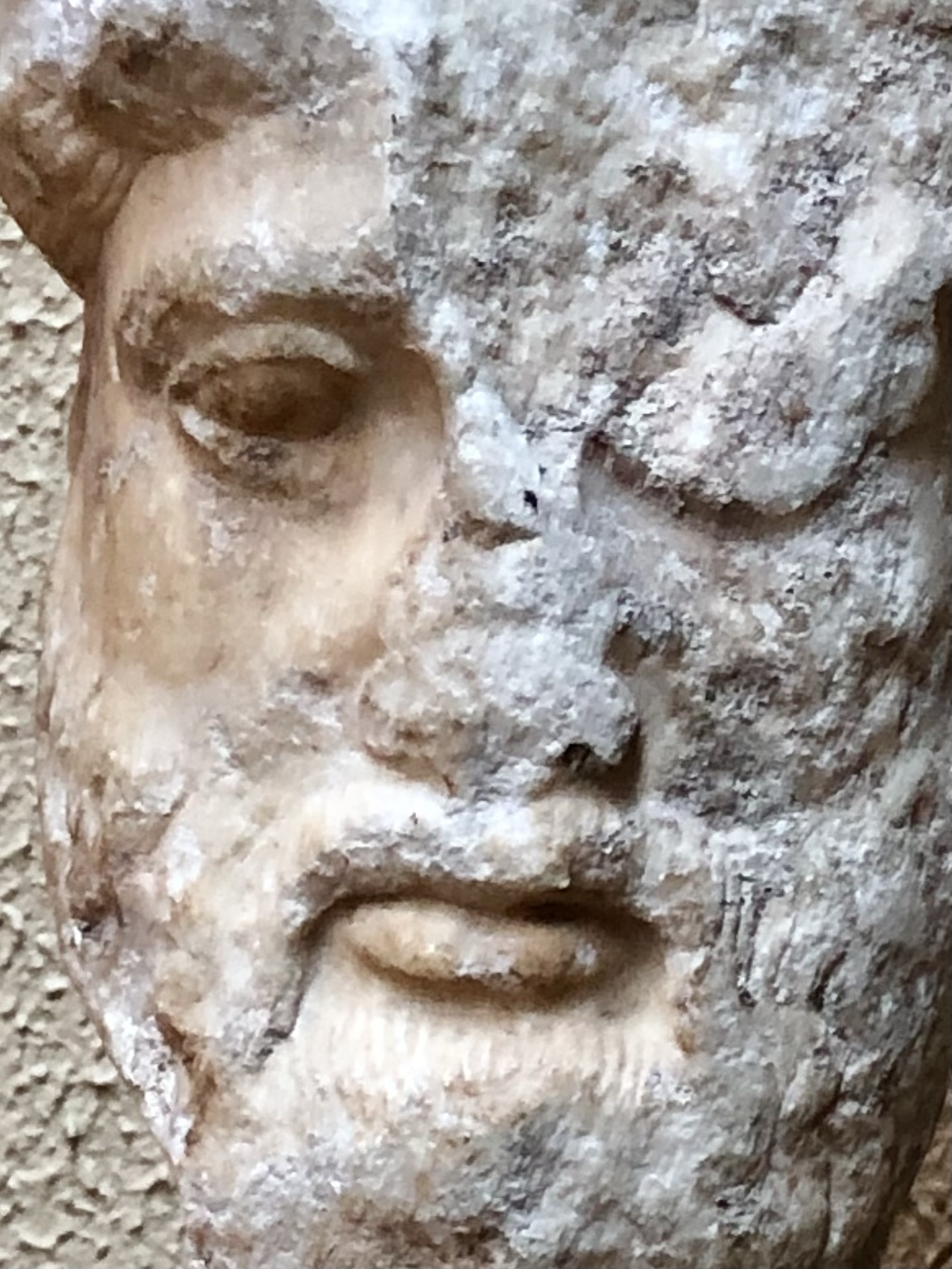 Photographie d’une tête abîmée par l’érosion du temps. Musée archéologique d’Andros, Grèce.