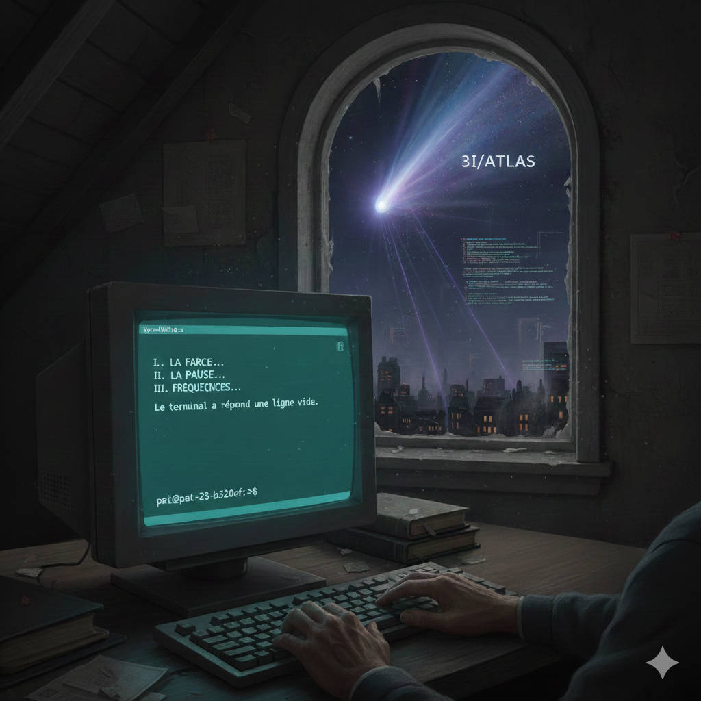 I. La farce On nous promet un tri sélectif par rayons X. La comète 3I/ATLAS arrive avec ses prophètes de comptoir qui annoncent le grand nettoyage des fréquences. Dans ma mansarde, je ne me sens pas très vaillant. Si le Jugement dernier ressemble à un audit de site web, je suis condamné d’avance.