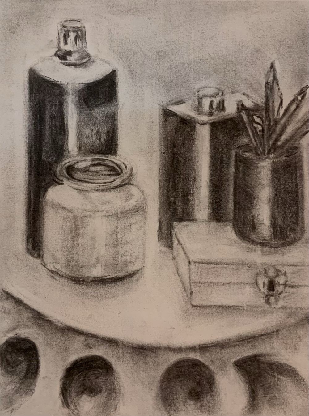 nature morte au fusain, travail d’élève.