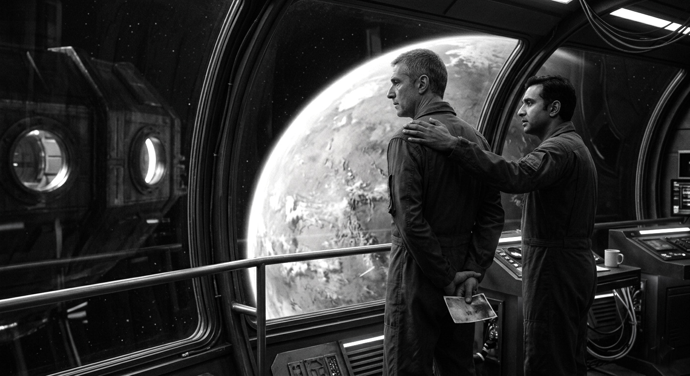 Il le trouva au module d’observation, debout devant le hublot principal. Dos droit pour une fois — les épaules pas voûtées, pas les mains dans les poches. Les mains dans le dos.