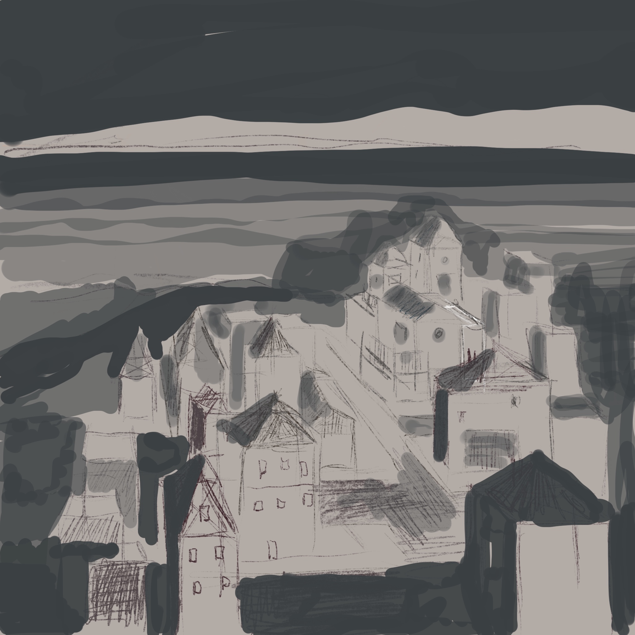 Dessiner un village de nuit. Exercice sur tablette. 2022.