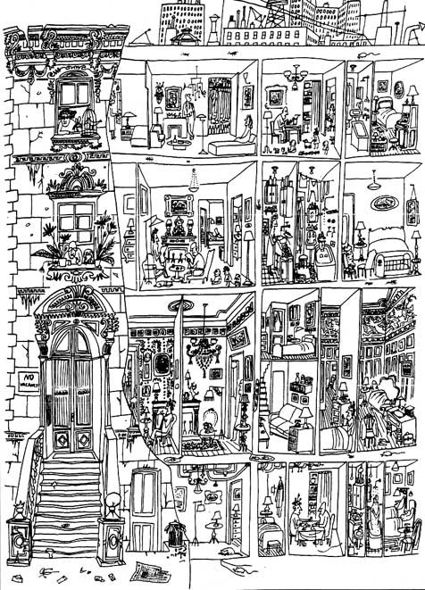 A l’origine raconte Perec l’idée lui est venue de l’observation d’un dessin : No vacancy de Saul Steinberg
