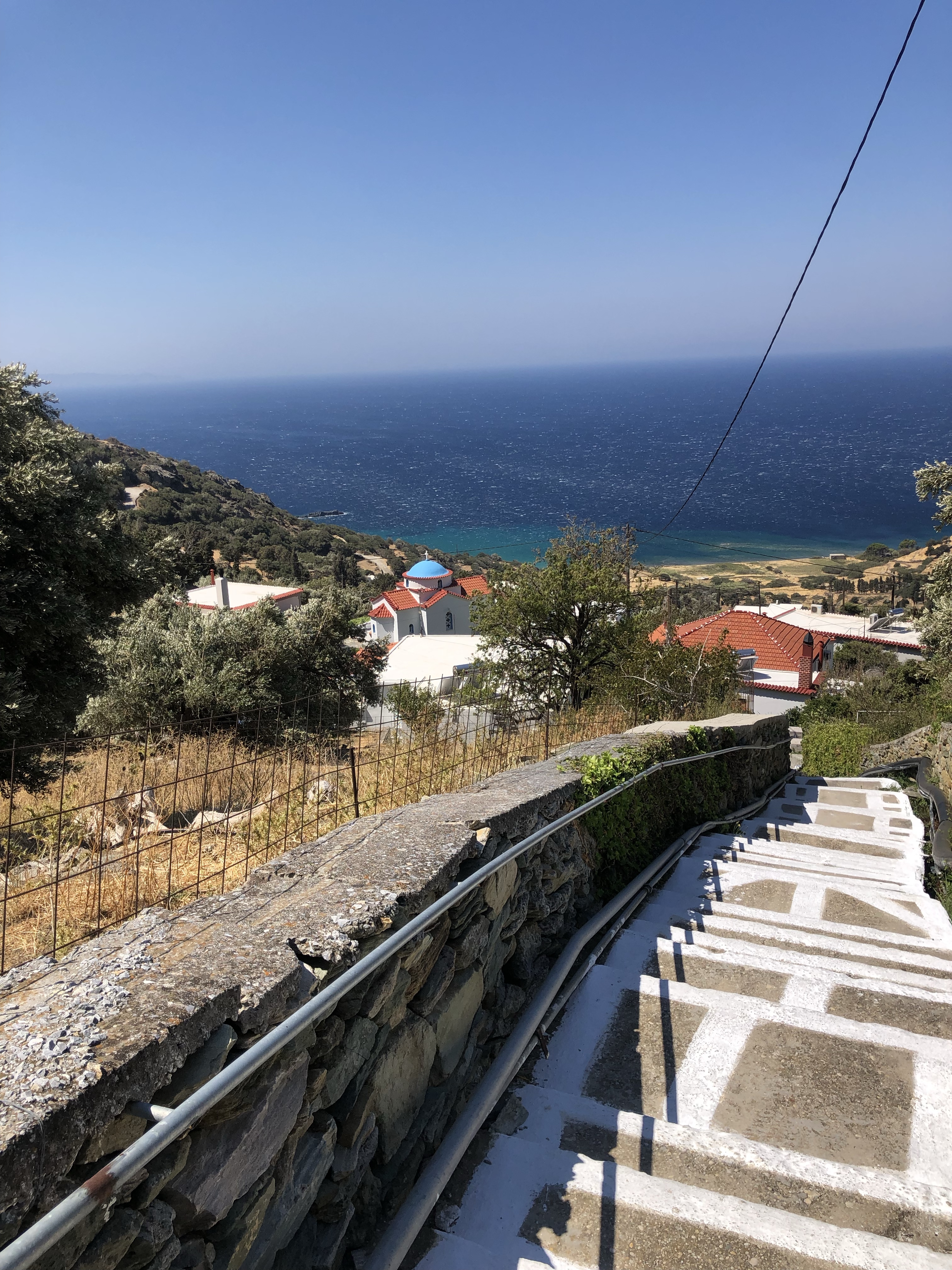 A mi-pente on découvre un groupe d’habitations, une petite église, et une source doit exister dans les parages car nous sommes accompagnés par le clapotis de l’eau durant quelques centaines de marches. En revanche nous ne verrons aucun habitant, les volets sont clos et les grilles de l’église également. Un petit chien nous accompagne sorti d’on ne sait où. Il disparaîtra aussi mystérieusement qu’il aura surgit lorsque nous remonteront les escaliers un peu déçus de n’avoir pas pu approcher les ruines. Celles-ci sont fermées au public, découpées en grandes parcelles entourées de grillage. Mais peu importe, durant quelques heures nous avons pu ressentir ce lieu, nous avons pu un peu imaginer, et partager avec les morts en nous appuyant sur le relief, les quelques traces laissées dans les constructions de pierre, les troncs noueux des oliviers.