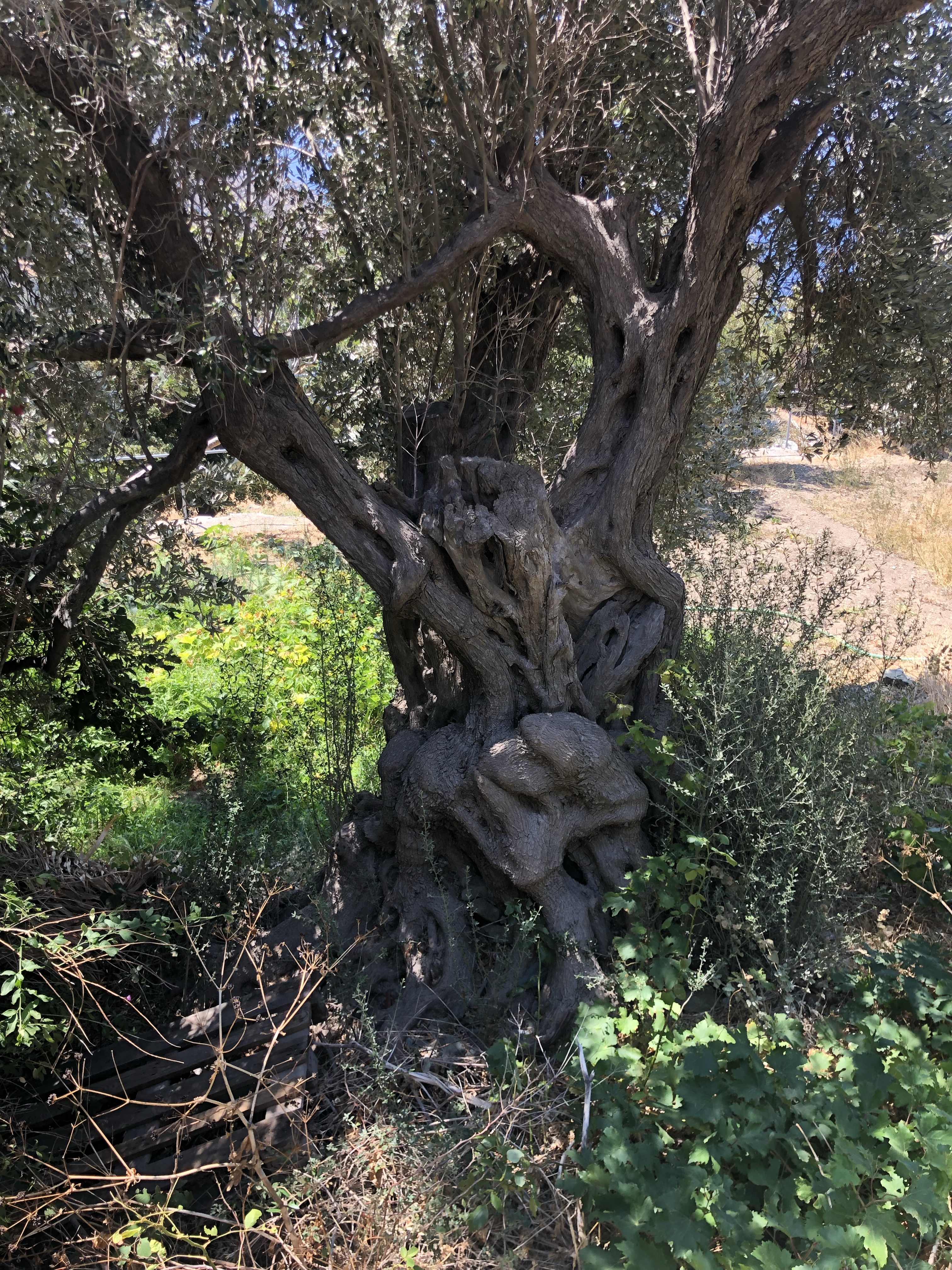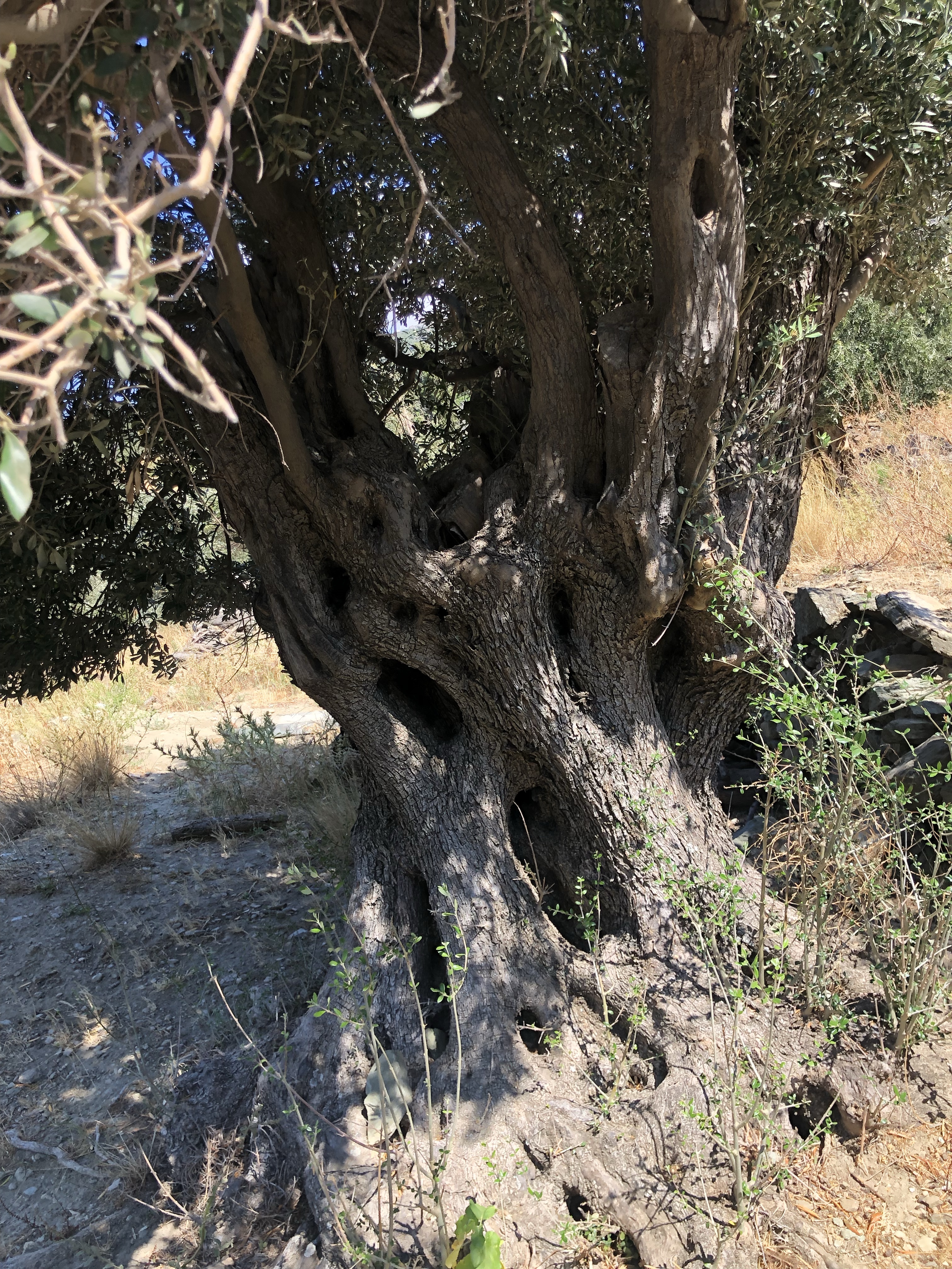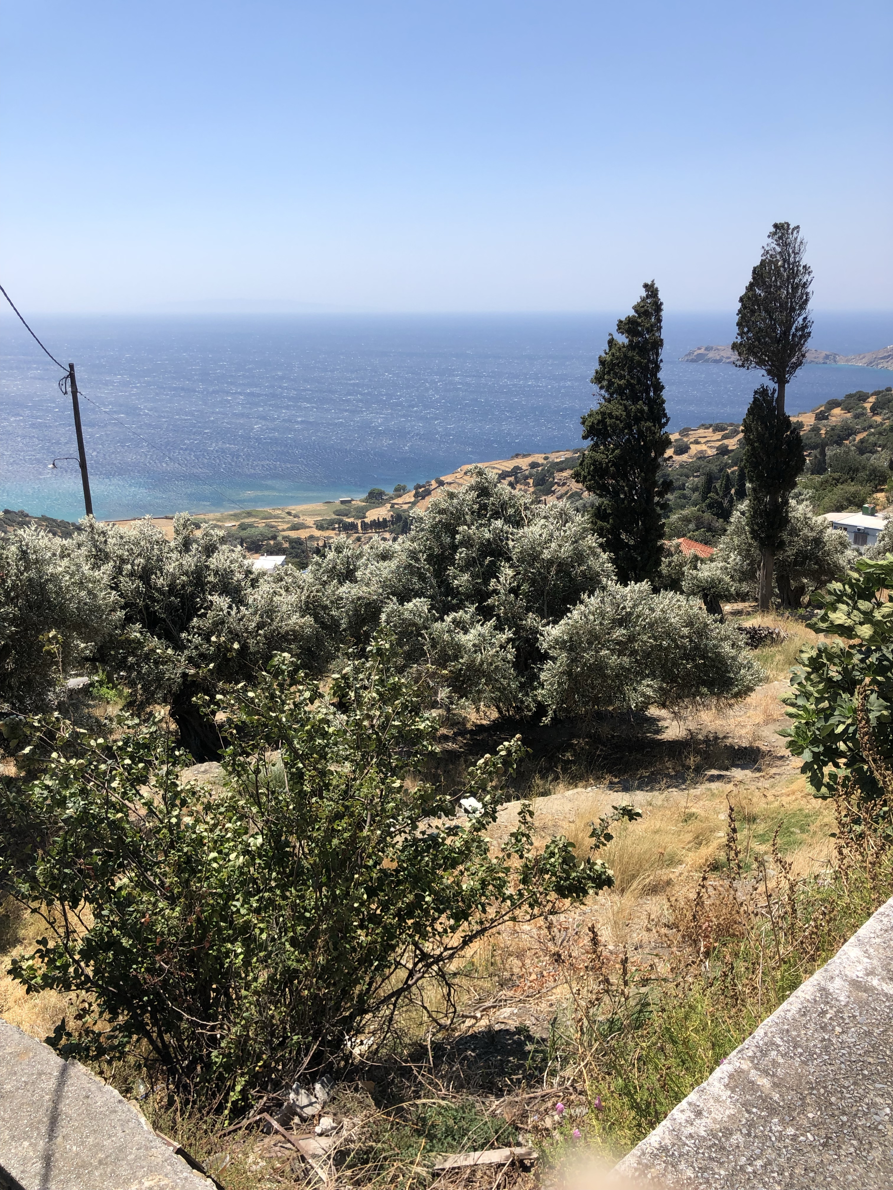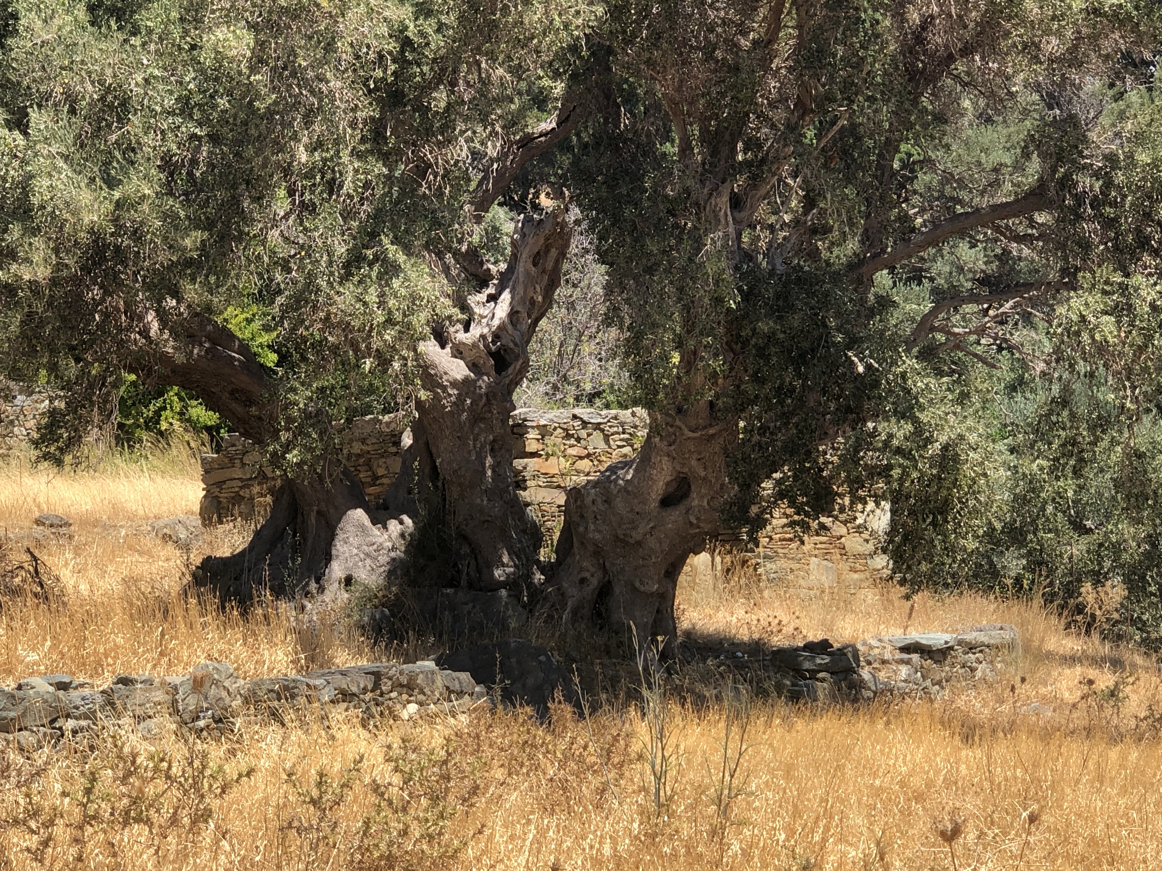 Il règne ici une atmosphère particulière sans doute due en premier lieu à la présence du mont Petalo qui surplombe la vallée s’étendant de façon abrupte vers la mer, et en second lieu aux arbres multi centenaires. C’est toute l’histoire des lieux qui semble inscrite sur les troncs imposants des oliviers et des platanes qui peuplent les pentes et nous accompagnent en silence tout au long des 1309 marches dégringolant jusqu’à la plage. De temps à autre lorsque le vent balaie les pentes et les feuillages, on jurerait entendre les voix entremêlés des anciens habitants de la vieille ville, en partie enfouie sous la mer.
