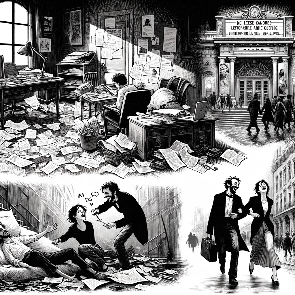 Dans un fouillis d’objets et de pensées, un couple tente de naviguer entre désordre et moments partagés. Quand l’ordinaire se pare d’aventure et que chaque détail révèle une part de leur complicité. Suivez leur trajet chaotique jusqu’au cinéma, une métaphore de leur relation, où l’ordre et le désordre se disputent la scène.|couper{180}