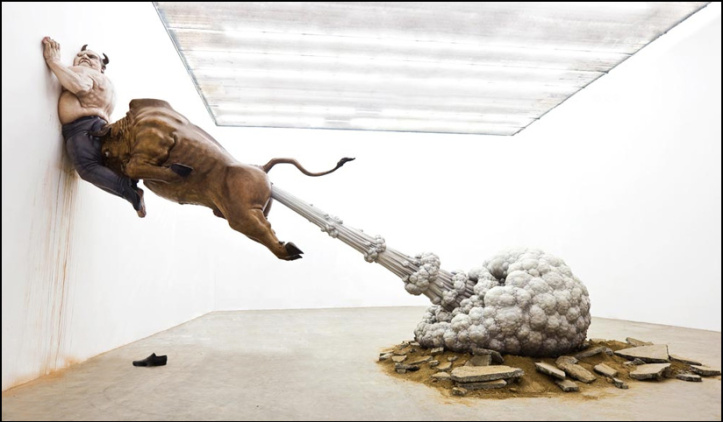 J’habitais une chambre de bonne au septième étage d’un immeuble place de la Bastille. Au troisième vivait la famille Laraison, le père directeur de la Banque de France. Le tapis rouge s’arrêtait à leur étage. Quand je dévalais les escaliers, je les croisais parfois. Monsieur Laraison, vêtu de gris. Sa femme, son ombre. Leurs marmots, joufflus, regard en biais. Le mardi, ils recevaient. À 20h, je remontais. Dans l’escalier : parfums inconnus. J’écoutais à la porte : rires bourgeois. J’en parlais à Pauline après l’amour. Nous riions. Cela nous rassurait. Le jour où j’ai perdu Pauline, j’ai quitté la piaule. Je me suis barré. Je ne les ai jamais revus. Parfois, ça me revient. Je colle mon oreille à la porte des souvenirs. Je revois Pauline. Puis un pet sonore fend l’air du troisième. Et je me mets à rire. Je pensais à tout ça en voyant une œuvre de Chen Wenling : Le taureau qui pète. En fait : Ce que vous voyez pourrait ne pas être réel. Un taureau propulsé par un pet, écrasant Madoff. La critique de la crise financière. Ou autre chose.|couper{180}