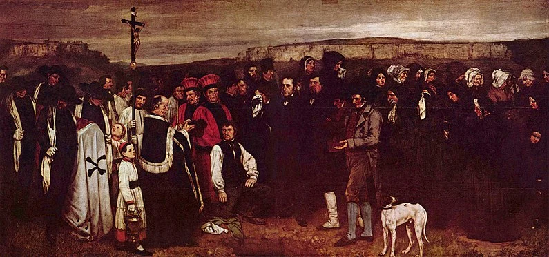 WordPress est devenu une vraie usine à gaz., je ne veux pas payer pour renouveler l’abonnement. Si des fans fortunés le désirent ils peuvent le faire, ( me suis fendu de présenter la bannière) . Pour mon compte, trop de problèmes, pas seulement financiers, depuis que JetPack ( GOOGLE ) est de la partie WordPress c’est du grand n’importe quoi. Et je vois que ce n’est pas fini, maintenant il y a BLAZE pour promouvoir les billets. ça me blase. C’est à dire tu paies t’es lu, tu paies pas tu disparais. Et bien soit, je m’en fous, ça fait des années que je m’entraine à disparaitre de toutes façons, une de plus ça ne m’en bouchera pas un coin. Vers la mi-juillet ce blog va donc disparaitre avec tout son contenu. J’ai effectué une sauvegarde pour récupérer les billets en local, lire désormais tout ça à tête reposée. Ou pas. Je suis plutôt tenté d’emblée par le ou pas. De recommencer autrement. En attendant de voir, peut-être de recommencer sur une version allégée de ce blog s’il survit à mon renoncement de payer je tiens à remercier toutes les personnes qui l’ont suivi, bien chaleureusement. Amicalement. Peinture Chamanique. Illustration : Courbet avait fait ce grand tableau pour se moquer de ces grands formats essentiellement prévus pour les scènes mythologiques ou d’histoire. Il a voulu peindre une événement banal, un enterrement, un enterrement à Ornans. Je trouve très bien cette image , adéquate pour un enterrement de blog.|couper{180}