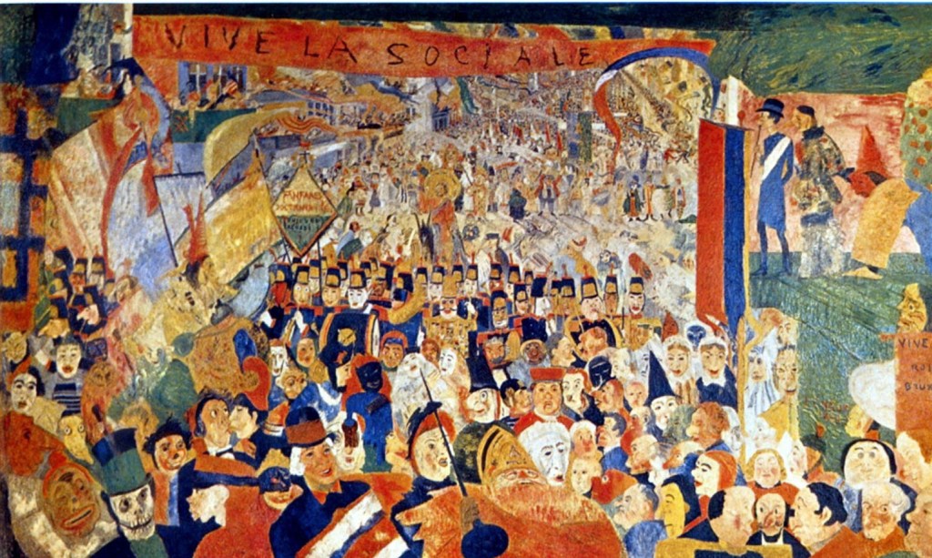 Illustration James Ensor Il est dans la rue. Le peuple appelé aussi gueux et chienlit, à l'image exacte de ceux qui prétendent le gouverner. On a du mal aujourd'hui à faire coïncider une certaine idée de culture, d'humanisme avec le foutage de gueule de tous les chefs d'états vis à vis de leurs peuples respectifs. Quand on se fout de la gueule du peuple c'est qu'on le considère comme une bête ; ce qu'il devient car un contenant vide se remplit de tous les noms qu'on veut bien lui donner. Autant de ridicule dans la vocifération des uns que dans la morgue des autres. Et non le ridicule ne tue toujours personne, désormais il fait même exister, il distribue les identités. Ensuite la soi disant misère ou pauvreté... Il n'y a qu'à se rendre dans la zone commerciale juste à côté pour voir avec quelle avidité certains remplissent leurs paniers leurs caddies avec au ventre l'affreuse peur de manquer, l'obsession de remplir d'amasser de collectionner. La queue aux pompes. L'absurde. Si on voulait vraiment marquer un refus politique descendre dans la rue n'est pas le moyen. Il faudrait utiliser les réseaux sociaux et dire n'achetez plus rien, ne buvez plus ne fumez plus, ne roulez plus, ne consommez plus. Contentez vous de peu voire de rien, et d'une pierre deux coups, non seulement l'état ses banques seraient en faillite, mais chaque citoyen retrouverait la joie de vivre, car il y a une vraie richesse, une jubilation dans la nudité.|couper{180}