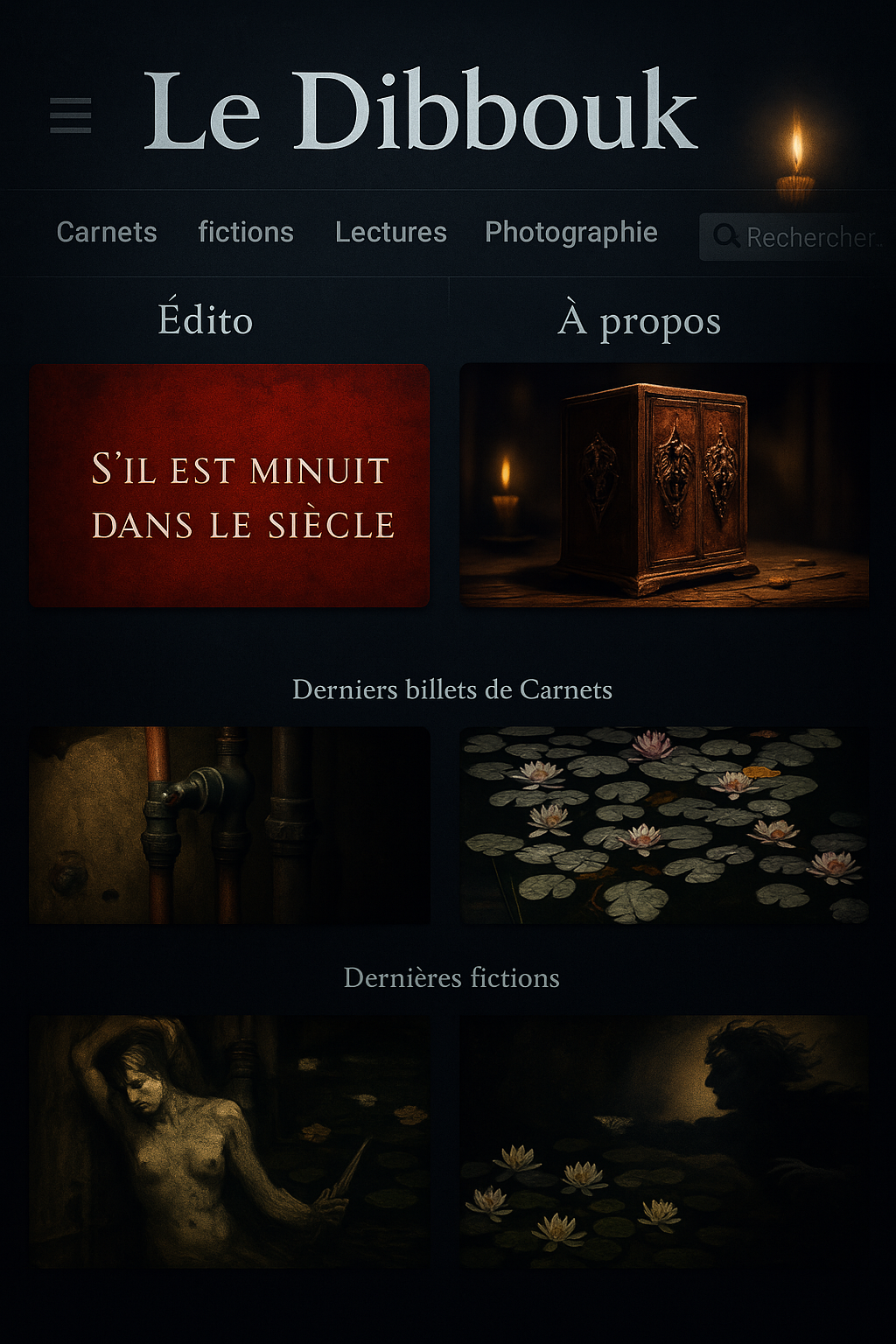 Réveil vers deux heures. Reprise du code en local. Peut-être que, finalement, tout ne doit pas être "justifié", notamment dans les descriptions des cartes. Petit clin d’œil à D.H. Ensuite, pas mal de galères pour installer le build Tailwind correct : la dernière version a trop de bugs. Le *output* se trouve dans le répertoire `dist`, le *input* dans le `rc`, le fichier `config.js` à la racine du site. À peine le temps de lever la tête, d’aller me faire un café, qu’il était déjà quatre heures. Puis, assez vite, la vidéo journalière de F. Me suis rendormi vers six heures pour me relever à huit. Ensuite, cours jusqu’à midi. S. a pris la Dacia pour aller à RDG : spectacle enfant, puis adulte, jusqu’à pas d’heure. Appel dans l’après-midi : seulement cinq réservations. Mangé une tartine beurrée, bu un café, reparti vers l’association jusqu’à dix-sept heures. Parti à pied, car impossible de démarrer la Twingo, qui était sur la réserve. Il faut voir dans la remise si j’ai des jerricans de cinq litres pour aller chercher du 95 demain. J’espère que ce n’est que ça. S. part une semaine à Paris, car M. part en formation. Elle appréhende de s’occuper de MX : il a encore refait le coup de se rouler par terre pour ne pas aller à l’école. On cherche. Peut-être une école pour "gros", un psy… S. est psy, ça devrait aller. Si elle ne s’énerve pas. Gros à parier que si. Peut-être que l’expérience de lecture des carnets de HPL avec F. m’apprend quelque chose. Des notes très courtes, cryptées. Pour soi. Pourquoi continuer à publier, dans ce cas ? Pour le rythme ? Pour ne pas perdre le rythme. On s’accroche à un rythme, difficile de le changer ? Pas de littérature dans ces carnets. Je l’ai déjà dit. Il faut se concentrer sur la fiction, je me dis. S’évader dans la fiction. Moins facile. Il faut beaucoup réécrire, pouvoir dire les phrases à haute voix, voir si ça sonne. Et plus je réécris, plus cela devient un véritable casse-tête, exactement comme ce code Tailwind que je compile et recompile sans arrêt. Je vide quelque chose avec ces phrases courtes. Hachées. C’est une purge. Une façon de faire place nette. Avant. Peut-être un préalable. Une étape nécessaire. Comme un moteur diesel. Il faut attendre que tous les voyants s’éteignent avant de tourner la clef de contact. Rien d’autre ne m’intéresse. Alors je vais boire un café, manger un morceau. Puis revenir devant l’écran. Voir ce qui arrive. Et m’y accrocher fermement. En passant j'ai découvert le modèle de génération d'images qui remplace désormais Dalle3 sur ChatGpt. Je lui ai demandé de me faire un visuel à partir de ma page d'accueil. Comment améliorer ? Sidération.|couper{180}