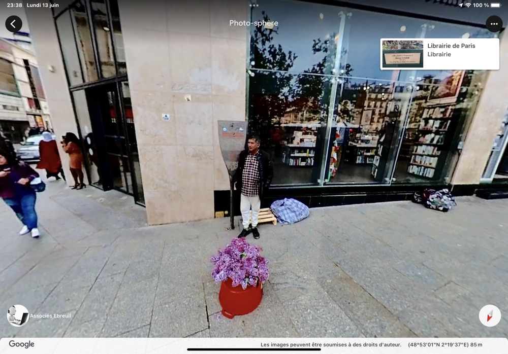 Un bouquet de lilas au premier plan sur le sol aux dalles disjointes et un homme qui se tient derrière les mains dans les poches près d’un parcmètre. Derrière lui objet en bois, une sorte de petite palette et un baluchon à carreaux blancs et bleus, et derrière encore la vitrine, des livres sur des rayonnages qui se confondent avec les reflets des immeubles la place Clichy. Sur la façade encore à la gauche de l’homme, des carreaux de couleur beige, sorte de faux marbre, deux petites photographies sont collés là en diagonale. Encore plus loin une femme adossée à une paroi de verre, près de l’entrée, robe orange qui s’arrête à mi cuisses, elle semble photographier quelque chose ou bien se remaquiller. Une autre tourne au coin de la rue manteau rouge sombre foulard bleu, tandis qu’une passante surgit ou disparait de l’image, en jean et baskettes consultant son portable.