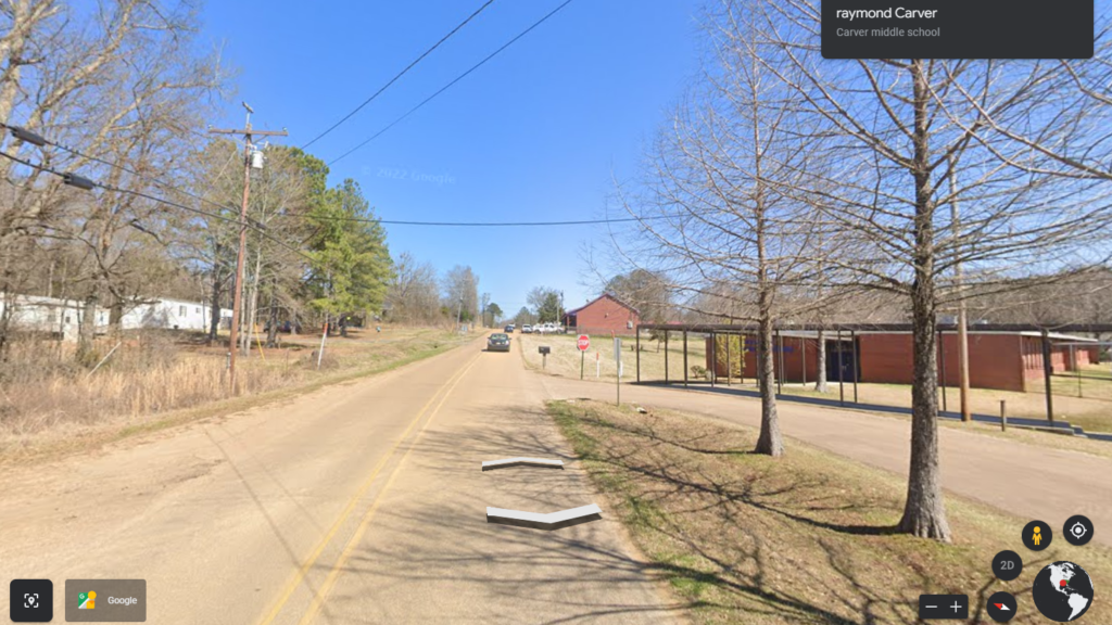 A droite les bâtiments de la Carver middle School,quelque part dans le Missisipi, à gauche au delà d’un terrain boisé des bungalows blancs, au milieu une route qui s’élève, le tout strié par les lignes électriques, le dynamisme de leurs obliques apaise l’ennui, l’immobilité procuré par les verticales. Il faut beau, peut-être froid, le soleil est sur la gauche, à l’est. Les arbres correspondent à leurs ombres, sans doute un milieu d’après midi. A part cette voiture au loin on ne voit personne.
