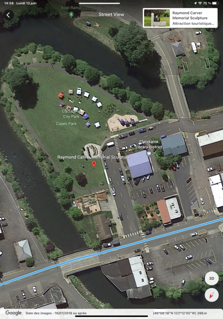 La voiture Google passe au sud du mémorial Raymond Carver, on ne peut s’y rendre à pied via le petit bonhomme, et il n’est proposé qu’une vue aérienne puis dans un encart, en haut à droite de l’écran , deux photographies, l’une prise en avril 2021 par Neil w et la seconde par MeA en juin 2022.