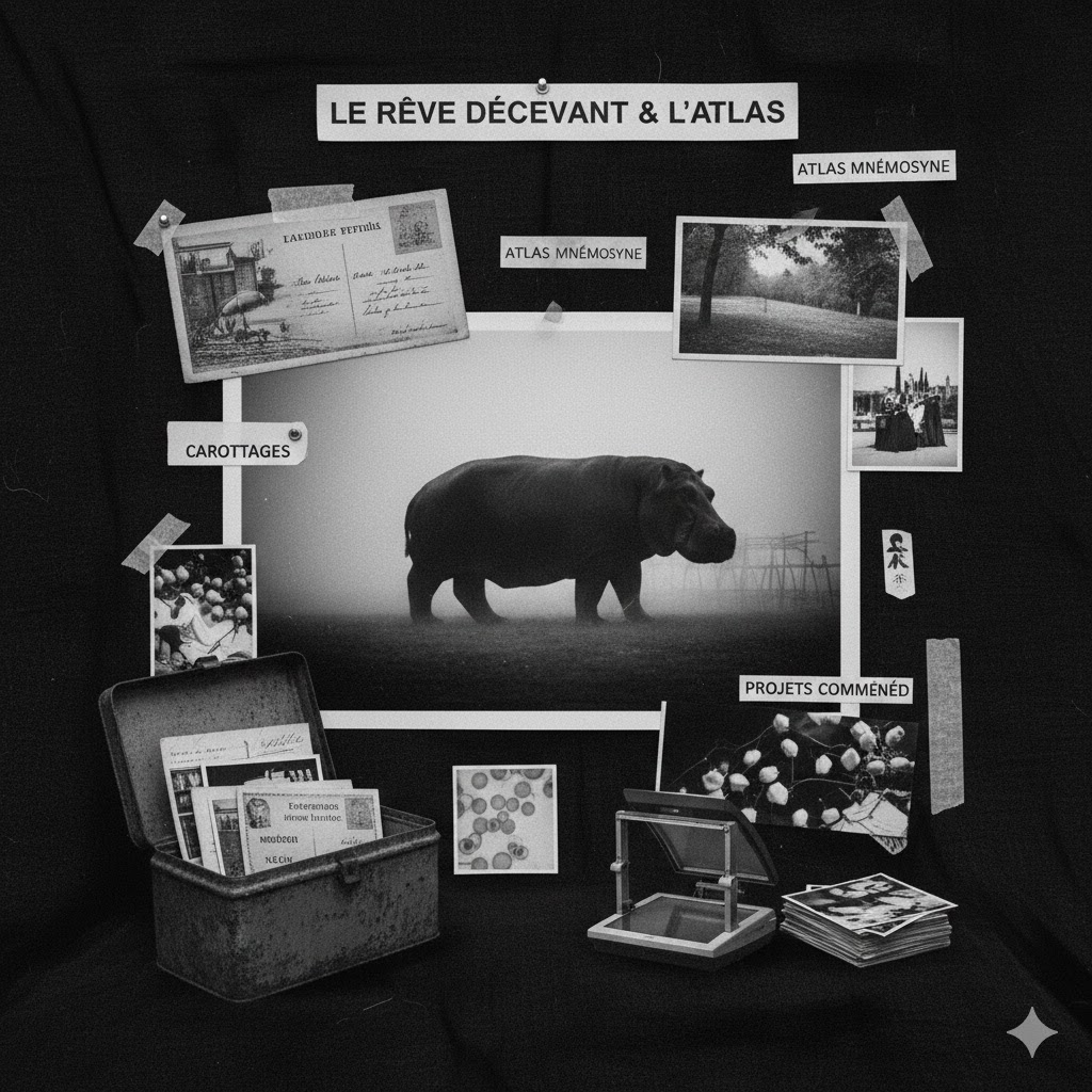 Rêve étonnant, qui pourrait être décevant si je m’étais attendu à autre chose qu’à être, une fois de plus, déçu en rêve. Enfin, c’est bien la seule fois que je verrai un hippopotame noir, c’est à espérer. Ce bruit horrible de ferraille qui me suit alors que je cours devant me reste au petit matin. Bien avancé sur l’Atlas Mnémosyne. J’ai réalisé plusieurs « planches », c’est-à-dire des prélèvements, des carottages dans la matière du site, et j’ai tenté de les organiser. Au début, les fichiers d’export en Markdown étaient imposants. La difficulté était de choisir peu de choses, mais qui fonctionnent. Le problème à résoudre est celui des images. Il va falloir aller puiser dans la boîte en fer, ressortir les photographies, les cartes postales, et, comme toujours, n’en sélectionner que quelques-unes. Et aussi scanner celles qui sont écrites au dos en estonien. Je ne sais pas combien de temps va durer ce projet. Tant de projets commencés en parallèle, et aucun n’a abouti encore. Est-ce que je travaille vraiment, ou est-ce que je me donne l’impression de travailler ? Encore une matinée où je ne pourrai pas m’enfoncer, où il faudra rester le menton hors de l’eau. Deux heures de cours sans boire la tasse. Ensuite, tout l’après-midi devant soi et la grande journée du dimanche. Ce qui ne veut d’ailleurs strictement rien dire puisque j’ai beau avoir tout le temps devant moi, il arrive que je n’en fiche rien du tout. Je n’ose pas gâcher ce genre de plénitude. illustration Gemini Flash|couper{180}