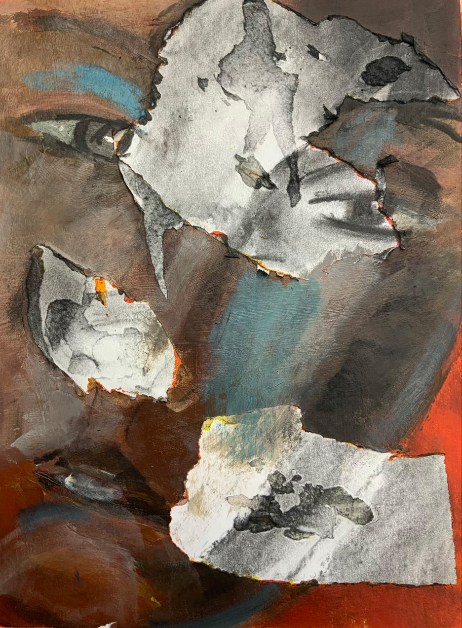 Je fais coller des bouts de papier journal, puis on peint en les oubliant : un fond, puis le fameux visage.