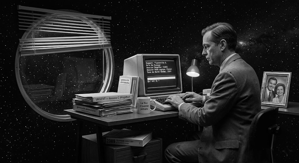 Mon bureau flotte dans le vide intersidéral depuis deux mille ans. Vous le connaissez, Monsieur le Directeur — vous y avez siégé lors de votre inspection du 14 février 3098, vous aviez noté que le store vénitien de la fenêtre gauche présentait une lame récalcitrante. Elle l’est toujours. La fenêtre donne sur du noir pailleté. Sur le bureau : le terminal, la corbeille arrivée qui déborde de grumescaille administrative, le mug Le fisc n’oublie jamais, la photo de mes parents dans son cadre argenté — les deux souriants, l’air de gens qui ignorent ce qu’ils ont produit.
