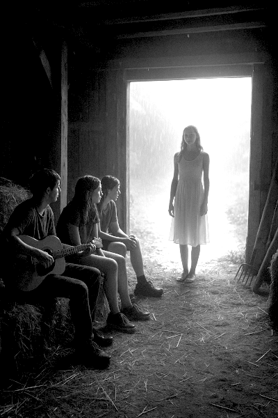 Été, Bourbonnais : on parle pour ne rien avouer ; trois amis, une fille ; l’air chauffe ; la pluie décide tout. Non pas une averse, mais une chute qui efface la route et fait de la grange un lieu ; non pas dedans ni dehors, un seuil, le plus étroit. La guitare cherche un centre — deux accords, à peine —, mais le centre manque, glisse avec l’eau le long des pierres ; on se rassemble, non pour être ensemble, pour tenir à l’abri du nom. Cela arrive (ce qui n’arrive pas) : dans l’encadrement, la lumière avant la personne ; une robe blanche que le jour traverse ; N., sœur de la fille, et pourtant étrangère, comme si la parenté avait été retirée. Grâce : non pas faveur, non pas bonheur, mais suspension ; quelque chose ôte la parole, met le corps à part, le cœur hors de lui. On ne sait pas si c’est entrer ou nous rejoindre ; elle ne vient pas, elle est venue, et avec elle l’écart. Le coup au cœur — non pas choc, déplacement — défait les gestes : les doigts ne touchent plus les cordes, ils gardent la distance. On ne voit pas son visage ; c’est la porte qui regarde. La pluie, reprise par le vent, devient une ligne claire ; la grange devient son contraire ; et ce qui reste de l’après-midi, tenu dans ce cadre, recommence à manquer.