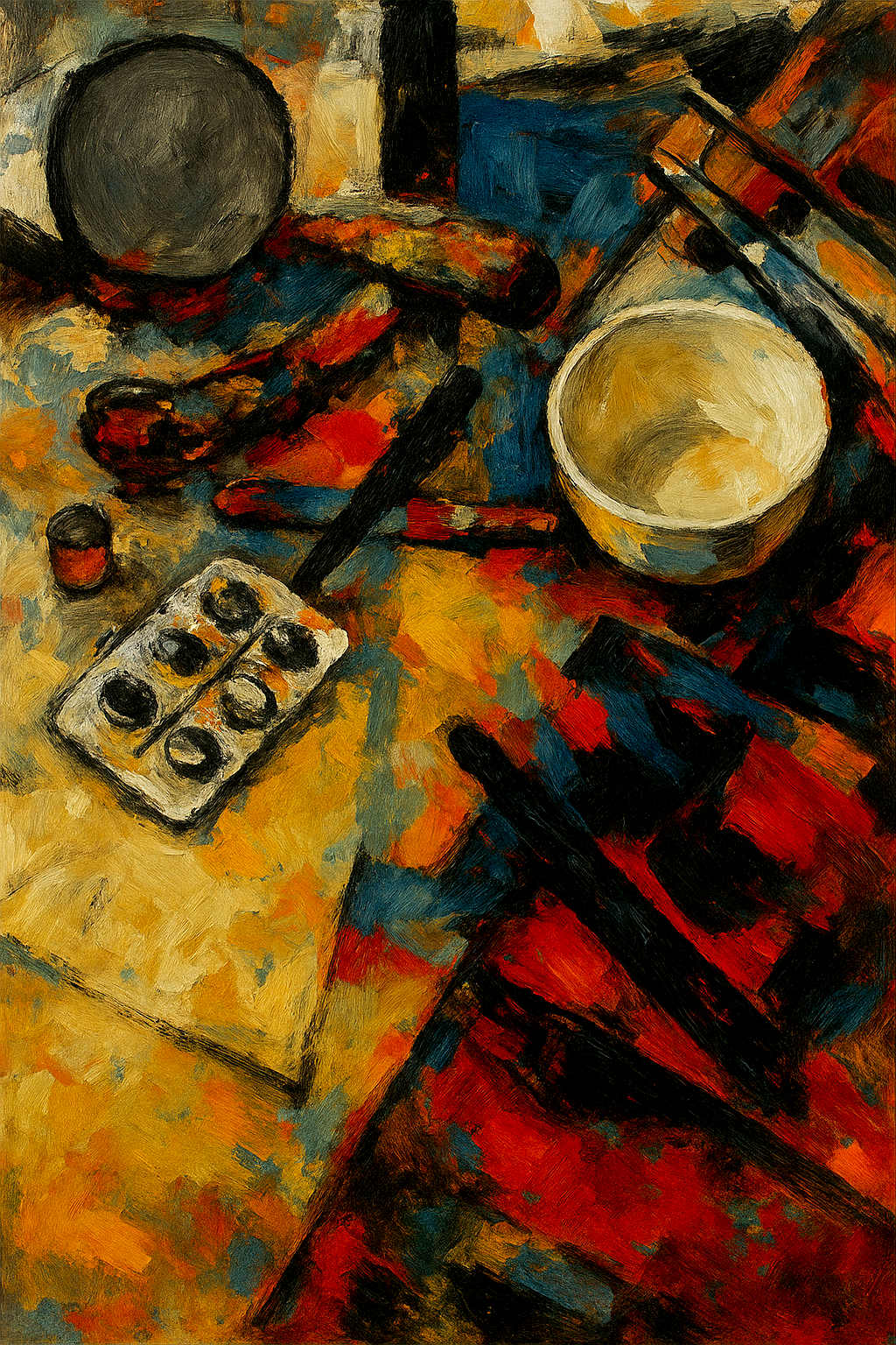 Un flacon plastique, survivant. Whyte spirit, encore utile. Pots d’acrylique. Une petite boîte en fer blanc, jadis paté, aujourd’hui médium. Une palette sale. Un agenda. Un carnet noir à l’élégance discutable. Un chevalet bancal, un filetage à revisser. Quelques morceaux d’essuie-tout tachetés, quelques miettes de tabac, reliques d’une semaine où l’on fumait encore, c’est-à-dire il y a une éternité. Peut-être la mort d’une habitude, peut-être un simple hoquet. On ne sait plus.
