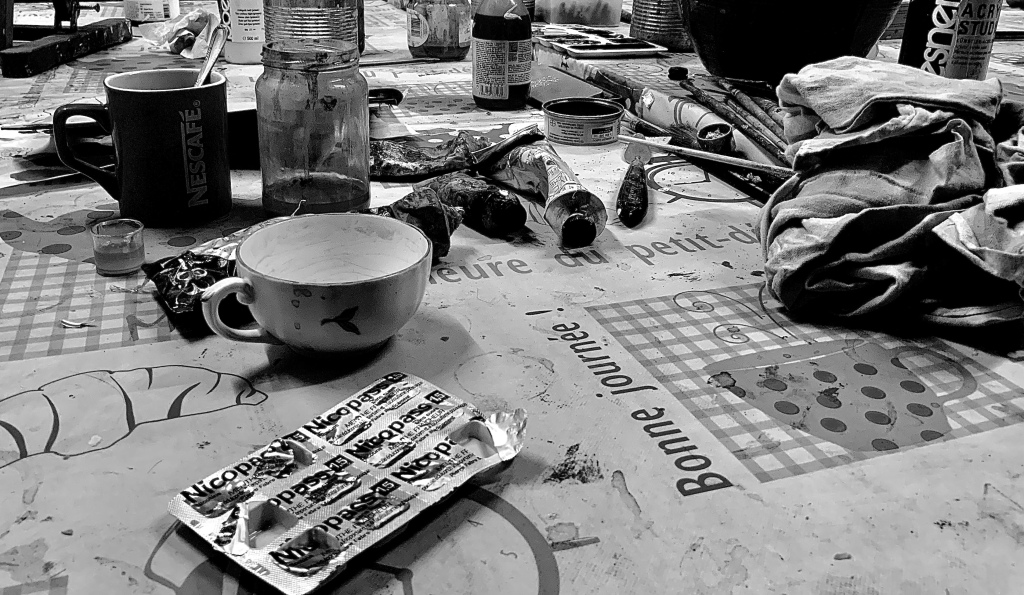 Sur cette table : une plaquette de pastilles à sucer, destinées à contenir une envie de cigarette qui s’est déjà manifestée trois fois depuis le lever. Une tasse, vide. Crème, bord rouge. Quelques tubes de couleur, certains sans bouchon, mollement affalés. Un ancien pot de moutarde reconverti dans le mélange à peindre. Un chiffon boule, un couteau à peindre, une carte de visite de gîte touristique, promesse d’un cadeau si achat. Quelques pinceaux, tête en bas, manche en haut, trempant mollement dans des liquides. Boîtes de conserve réaffectées, haricots-cassoulet, au service du nettoyage pictural. Un saladier en terre, trente tubes, un peu de déroute chromatique.