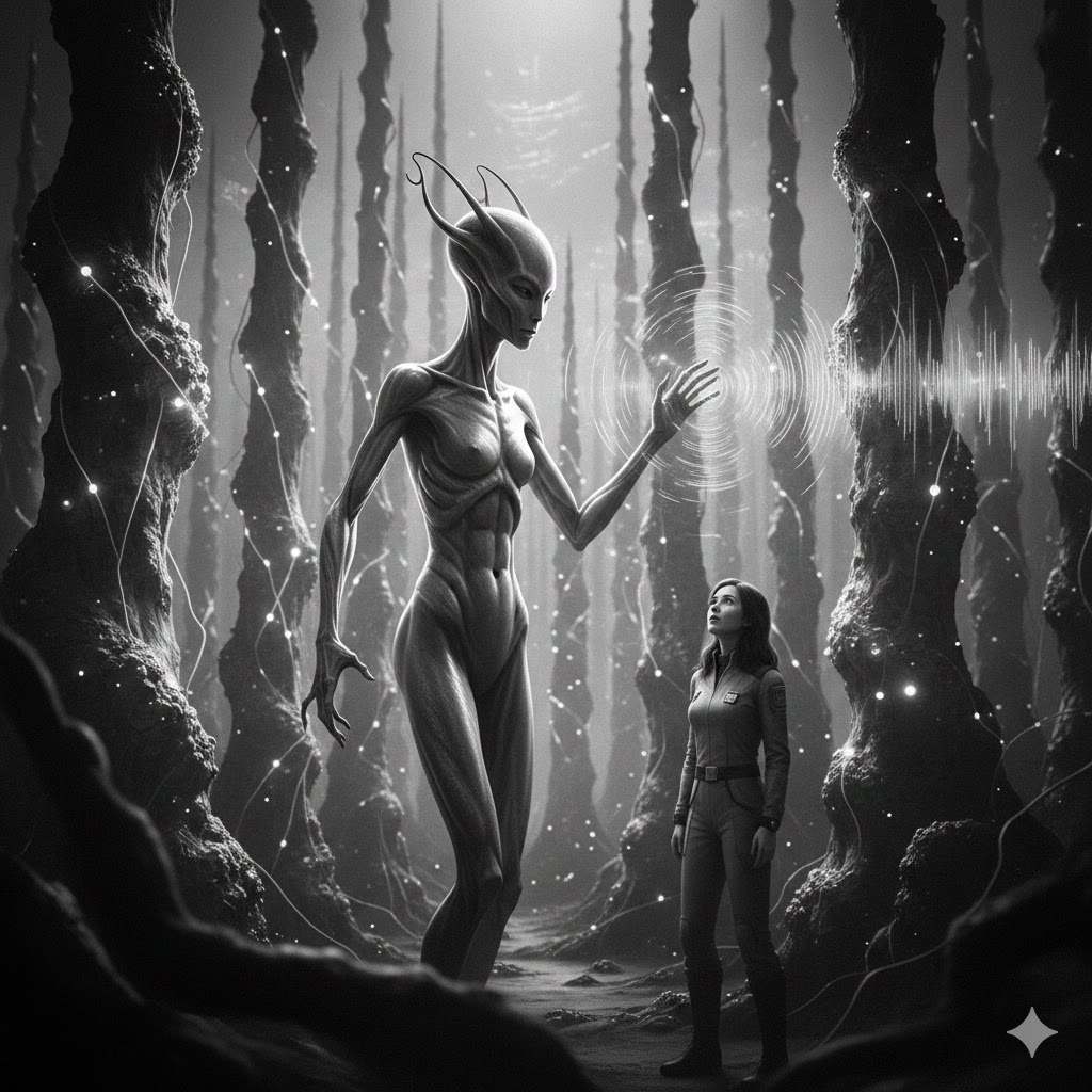 Titre provisoire : La Symphosphère ou L'Accordeur Épigraphe : "Ce que vous appelez silence est notre plus grande cacophonie." — Ancien proverbe de Caelus Premier jet — Chapitre 1 : Le Désaccord Le vaisseau Harmonius se posa dans un murmure d’antigrav, silencieux comme tout ce que concevait l’Union Terrienne. À travers le hublot, le lieutenant Elara Voss contempla le paysage de Caelus. Ce n’était pas une ville. Pas au sens humain. Il n’y avait ni tours, ni routes, ni grilles. À la place, des structures organiques et cristallines émergeaient du sol comme des stalagmites géantes, disposées en spirales fractales. Entre elles, des filaments d’énergie lumineuse palpitaient doucement, tels des nervures. Rien ne bougeait, et pourtant tout semblait… vibrer. -- Rien ne correspond aux scans architecturaux de la base de données, commenta Kaelen, le xéno-archéologue. Pas de métal, pas d’électronique concentrée. On dirait une forêt minérale. -- Les signes de vie ? demanda Elara. -- Massifs. Des milliers de signatures biométriques, mais dispersées de façon homogène. Pas de foyers, pas de centres administratifs. Comme si toute la planète était une seule cité. Ils avaient atterri en périphérie de la zone la plus dense, là où les structures étaient plus basses, comme des notes graves avant le crescendo. La mission était simple : premier contact, évaluation du niveau technologique, échange culturel si possible. Une routine. Le sas s’ouvrit. L’air était frais, chargé d’un parfum d’ozone et de quelque chose d’autre… une sensation presque auditive, comme un bourdonnement à la limite du perceptible. Elara sortit, son enregistreur environnemental à la main. Elle perçut alors le premier paradoxe : le silence. Aucun bruit de machine, aucun cri, aucun murmure de voix. Seul le souffle du vent entre les structures, qui produisait des tonalités changeantes, mélancoliques et complexes. -- Ils doivent communiquer par signes, ou par phéromones, avança Kaelen, ajustant ses capteurs. C’est alors qu’Elle arriva. Aucun pas n’annonça sa venue. Elle sembla simplement émerger de la lumière diffuse, glissant entre deux grandes colonnes irisées. Son corps était élancé, recouvert d’une peau nacrée qui changeait subtilement de teinte selon l’angle de la lumière. Pas de bouche visible. Mais ses mains… longues, aux doigts multiples, qui semblaient frémir en permanence. Elle s’arrêta à trois mètres. Et sans geste, sans son, Elara sentit une présence se former dans son esprit. Ce n’était pas une voix. C’était une sensation tonale, une note fondamentale, grave et apaisante, accompagnée d’un sentiment-image : Bienvenue. Curiosité. Observation. -- Mon dieu… elle télépathe, chuchota Kaelen. -- Non, répondit Elara, les yeux écarquillés. Ce n’est pas télépathique. C’est… acoustique. Elle projette une fréquence que mon cerveau interprète comme une émotion. La Caelusienne leva une main. Du bout de ses doigts, une vibration presque visible fit trembler l’air. En réponse, la colonne derrière elle émit un léger hum, une tierce mineure parfaite. Puis une autre colonne plus loin répondit, une quinte. En quelques secondes, une brève phrase musicale se propagea dans la ville-structure, comme un écho organisé. -- Elle vient de dire quelque chose à sa cité, réalisa Elara. Et la cité a répondu. Chapitre 2 : La Gamme des petites choses Les jours suivants furent une lente immersion dans le vertige. Les Caelusiens n’avaient pas de langage parlé. Leur communication était une modulation de fréquences subtiles, émises par des membranes sous leur peau, perçues par des organes en forme de lyre sur leur crâne. Leur écriture ? Des patterns de vibrations encodés dans des cristaux résonants, qu’ils « lisaient » en les effleurant. Leur technologie n’utilisait ni roue, ni levier, ni électricité. Elle utilisait la résonance harmonique. Elara les observa un jour « construire ». Un groupe se rassembla autour d’un amas de poussière minérale. Ils commencèrent à émettre, ensemble, un accord complexe. La poussière se mit à vibrer, à danser, à s’organiser en filaments, puis en structures, comme du sable sur une plaque chantante, mais à une échelle monumentale. En quelques heures, une nouvelle « colonne-habitat » s’éleva, parfaitement accordée aux structures voisines, intégrée à la symphonie géométrique de la cité. -- Ils ne bâtissent pas, comprit Kaelen, sidéré. Ils composent. La matière est leur instrument, et l’harmonie leur outil. Leur société n’avait ni gouvernement, ni lois écrites. L’ordre social émergeait de « l’Accord Global », une symphonie environnementale constante à laquelle chaque individu s’ajustait. Un conflit naissait-il ? Il se manifestait par une dissonance locale. Les anciens, les « Accordeurs », intervenaient alors non pour juger, mais pour proposer une nouvelle fréquence de conciliation, un intervalle qui transformerait le conflit en contrepoint enrichissant. Elara apprit à percevoir, non pas avec ses oreilles, mais avec son corps tout entier. Elle apprit que le « vent » qu’elle entendait n’était pas aléatoire : il était canalisé, sculpté par les structures pour apporter des nutriments, polir les surfaces, et diffuser les messages à grande échelle. La ville entière était un instrument vivant, et ses habitants en étaient les musiciens. Chapitre 3 : La dissonance La crise survint le dixième jour. Une équipe terrienne, en analysant une « zone résonante », activa par inadvertance un scanner à impulsion magnétique. Pour les humains, un simple clic. Pour les Caelusiens, ce fut un coup de gong strident et discordant, une violence sonore pure qui se propagea comme une onde de choc dans le réseau sensible de la cité. L’effet fut immédiat. Les structures pâlirent. Les Caelusiens, toujours si gracieux, se tordirent de doul