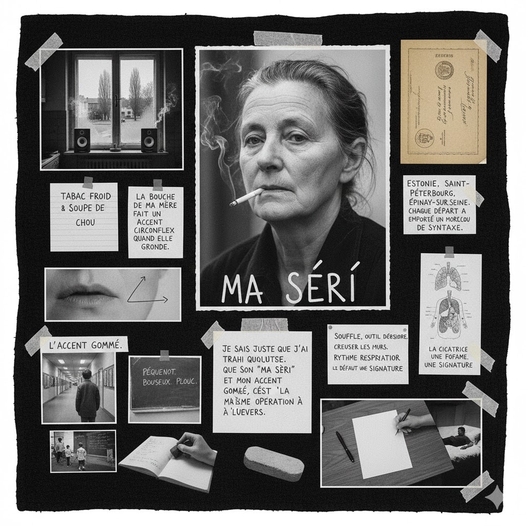 Ma Séri — Récit I. La cuisine sent le tabac froid et la soupe de chou. Valentine est debout devant la fenêtre, une Disque Bleue au coin des lèvres. La fumée monte en volutes grises. Dehors, l'avenue des Piliers, les peupliers qui tremblent dans le vent de novembre. Ma mère crie depuis le couloir. Sa voix tape contre les murs. Des mots que je ne comprends pas encore mais qui me font reculer contre le buffet. Ma grand-mère se retourne, pose sa cigarette dans le cendrier, tend la main vers moi. Ma séri, elle dit. Sa voix racle. Le "r" n'est pas à la bonne place. Le "ch" de "chéri" est devenu un "s". C'est une langue hachée, une langue qui a dû tout abandonner pour arriver jusqu'ici. Estonie, Saint-Pétersbourg, Epinay-sur-Seine. Chaque départ a emporté un morceau de syntaxe. Tais-toi, elle dit à ma mère. Il ne comprend rien. C'est un enfant. Mais le pire, c'est que je comprends. Je comprends que je suis celui à cause de qui on crie. Je comprends que la bouche de ma mère fait un accent circonflexe quand elle gronde. Je comprends que Valentine me protège avec sa voix abîmée, son "ma séri" qui n'est pas du vrai français. Plus tard, dans la chambre froide où on m'a mis au lit, j'entends encore le bruit de leurs voix. Le volume baisse. Ma grand-mère fume une autre cigarette. L'odeur passe sous la porte. Je m'endors sur ce mot. Ma séri. Méthode et caresse. Une langue qui vient d'ailleurs et qui me berce mieux que toutes les formules correctes. II. Septembre. Le collège du Val d'Oise. Les couloirs sentent le désinfectant et la craie. Je viens de quitter la forêt de Tronçais, les collines du Bourbonnais, la maison avec le jardin. On m'a arraché à la terre pour me planter dans le béton. Je parle comme un paysan. L'accent traîne sur les voyelles, roule sur les "r". Le premier jour, j'ouvre la bouche en classe de français pour répondre à une question. Les rires démarrent avant que j'aie fini ma phrase. Péquenot. Bouseux. Plouc. Je ferme la bouche. Je rentre à la maison avec le goût du sang dans la gorge à force de serrer les dents. Mon père dit "bouge-toi" quand je traîne dans le couloir. Ma mère dit "tu pourrais faire un effort". Alors je fais l'effort. Je surveille chaque mot. J'écoute comment parlent les autres, ceux de la banlieue, ceux qui ont l'air de savoir. Je gomme. J'efface. Je lisse. Ca prend des semaines. Des mois. Une année entière à guetter ma propre voix comme un ennemi. À traquer le moindre dérapage, la moindre trace de campagne dans ma prononciation. Je perds l'accent. Je perds quelque chose d'autre avec, mais je ne sais pas encore quoi. Quand je retourne chez Valentine, elle me regarde bizarrement. Elle allume une Disque Bleue, tire une longue bouffée, me dit : Maintenant tu parles comme eux. Je ne sais pas si c'est un reproche ou une constatation. Je baisse les yeux. Je sais juste que j'ai trahi quelque chose. Que son "ma séri" et mon accent gommé, c'est la même opération à l'envers. Elle, elle a refusé de perdre sa trace. Moi, j'ai tout effacé pour survivre. Première trahison. Premier lissage. III. Beaucoup plus tard. Une chambre. Une table. Des feuilles blanches. Je suis fatigué. Pas la fatigue qui casse, la fatigue qui nettoie. Celle qui débarrasse de tout ce qui ne convient pas. La vigilance s'est usée à force. Je n'ai plus la force de faire semblant, de surveiller ma voix, de gommer les traces. Je me couche dans le lit. Je ferme les yeux. Je me concentre sur mon souffle. L'outil le plus dérisoire. Inspirer. Expirer. Ralentir le rythme. Creuser les murs avec cette technique ridicule : la respiration. Et dans ce silence habité, quelque chose remonte. Pas un souvenir. Une texture. La voix éraillée de Valentine. Son "ma séri" qui n'a jamais voulu se corriger. Son obstination à garder la fissure. Je comprends soudain que ce n'était pas du français raté. C'était une langue autre. Une langue qui pointait vers l'origine, vers un lieu où tout était tassé avant l'explosion. Estonie. Exil. Pogroms. Tout ça dans deux syllabes mal prononcées. Et je comprends autre chose aussi : que je ne peux pas écrire en faisant semblant d'avoir une voix impeccable. Que si j'écris, il faut que ce soit avec la fissure, pas malgré elle. Avec l'accent gommé qui revient quand la fatigue dissout les postures. Avec le "ma séri" qui résonne comme une formule de réparation. Je me relève. Je m'assieds à la table. Je prends une feuille. Je ne sais pas ce que je vais écrire. Je sais juste que ça va respirer d'une certaine manière. Avec des pauses. Avec des hachures. Avec un rythme qui vient de la gorge abîmée de Valentine, du souffle court du survivant, du silence d'avant le Big Bang. L'écriture ne répare rien. Elle transforme. Elle fait de la cicatrice une forme. Du défaut une signature. De "ma séri" une langue possible. Alors j'écris.|couper{180}
