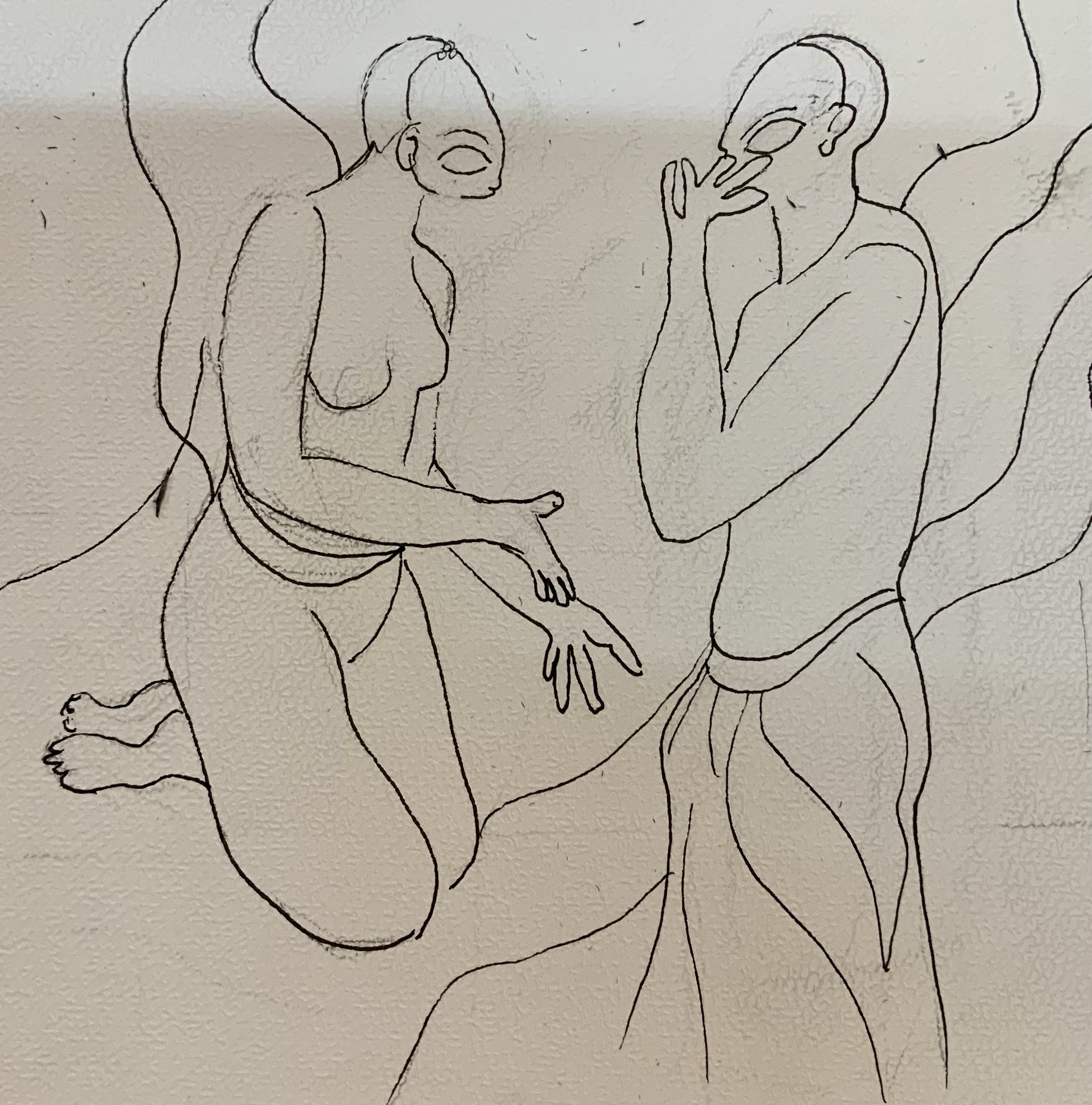 Une petite esquisse, puis un encrage au feutre et la recherche des couleurs …