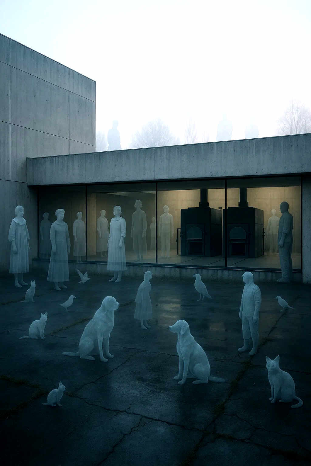 The building’s a plain concrete block, square, nameless. One long window strip runs across the front, but you can’t see through it. First time I came, I thought I had the wrong place. Inside, it’s clean, cold, functional. Smooth floor, bare walls. Everything echoes halfway. The machines are black, massive, silent. Cremation furnaces. The one I use most often is called Rouge-Gorge. It says so on the plate. First time I saw it, I smiled. I haven’t smiled since.