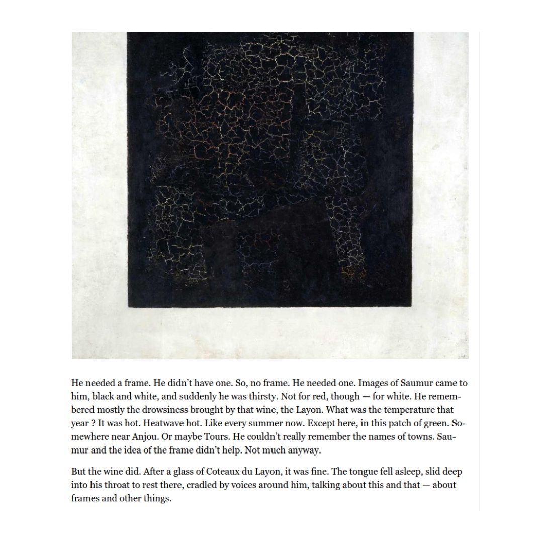 the frame He needed a frame. He didn’t have one. So, no frame. He needed one. Images of Saumur came to him, black and white, and suddenly he was thirsty. Not for red, though — for white. He remembered mostly the drowsiness brought by that wine, the Layon. What was the temperature that year ? It was hot. Heatwave hot. Like every summer now. Except here, in this patch of green. Somewhere near Anjou. Or maybe Tours. He couldn’t really remember the names of towns. Saumur and the idea of the frame didn’t help. Not much anyway. But the wine did. After a glass of Coteaux du Layon, it was fine. The tongue fell asleep, slid deep into his throat to rest there, cradled by voices around him, talking about this and that — about frames and other things. If I write like this for five straight days, he thought, the end might be better than the beginning. But that was a quick thought, something someone once said — or maybe he’d heard it somewhere. One should be wary of second-hand truths. They’re never free. You pay for them sooner or later — cash on the nail — at the end of the party, you drink the cup to the dregs, all the way down the fingernails, just like you're supposed to. Unless, maybe, he found a way to lobotomize himself without guilt or shame — and write down whatever poured out of his skull. This mess. Which, when you think about it, might be prettier than all that carefully curated stuff we keep under glass. Pretty. But not in the way it looks. More in the way it moves. Pretty as in behaving. And now we know what appearances really are. We don’t want to appear like that anymore, not out in the open. We’re done with the battlefield. Its landmarks too. He was looking in the fringe festival program for a play someone had told him about — My Name is Asher Lev — but he couldn’t find it in the 2025 lineup. Too bad, he almost said to himself. Then he wondered who had recommended it. Did their taste match his ? How could they know what he liked, anyway ? He didn’t know. It made him pause. Next time, when he’d want to recommend something himself, he’d remember this. What’s behind a recommendation, really ? Doesn’t always smell of roses. He was afraid of that. Not that he feared smells. That was just a polite way of saying — It stinks like shit Le cadre Il faut un cadre. Tu n’en as pas. Tu n’as donc pas de cadre. Il faut un cadre. Lui vinrent des images de Saumur, en noir et blanc, et il eut soudain très soif. Encore que ce ne fût pas de rouge, mais de blanc. Il se souvint surtout de la torpeur apportée par ce vin du Layon. Combien de degrés faisait-il cette année-là ? C’était chaud, caniculaire — probablement comme chaque été, désormais. Sauf ici, dans ce petit endroit de verdure, pas très loin d’Anjou. Ou de Tours. À vrai dire, il ne se souvenait plus vraiment des noms des villes. Saumur et le cadre n’aidaient pas. Du moins, pas vraiment. La torpeur était bien plus efficace : au bout d’un verre de coteaux du Layon, c’était bon. La langue s’endormait, elle rentrait tout au fond de la gorge pour aller dormir, bercée par les voix alentour, parlant de choses et d’autres, de cadres et de bien d’autres choses encore. Si j’écris ainsi durant cinq journées entières sans m’arrêter, je me dis qu’il est possible qu’avec la fatigue, la fin soit bien meilleure que le début. Mais c’est un jugement à l’emporte-pièce, quelque chose qui m’a été rapporté par je ne sais qui, ou quoi. Il faut se méfier des pièces rapportées. Elles ne sont pas gratuites. Il faudra les payer, tôt ou tard — rubis sur l’ongle, à la fin de la fête, boire la coupe jusqu’à la lie, jusqu’au bout des ongles, comme il se doit. À moins que je ne trouve une technique pour parvenir à me lobotomiser, sans peur et sans reproche, puis à écrire tout ce qui s’échappera ainsi de mon crâne. Ce pêle-mêle. Bien plus joli, dans le fond, que tout ce qu’on veut toujours mettre sous cloche ou sous verre, en avant. Joli. Une conduite bien plus qu’une apparence. Car nous savons maintenant ce que sont les apparences. Nous ne désirons plus apparaître comme ça, à tout bout de champ. D’ailleurs, nous en avons fini avec la bataille et ses lieux-dits. Je cherchais, au programme du Off, une pièce dont on m’avait parlé : Je m’appelle Asher Lev. Et je ne la trouve pas pour 2025. Dommage. J’allais me dire : dommage, quand je me suis demandé qui m’avait recommandé cette pièce. Ses critères allaient-ils être les miens, en matière de goût ? Comment cette personne connaît-elle mes goûts pour me recommander ce genre de pièce ? Je l’ignore. Ça fait réfléchir. Je veux dire : la prochaine fois que moi, je voudrai recommander quelque chose, il faudra que je repense à ça. Derrière la recommandation, que se cache-t-il vraiment ? Ça ne sent pas toujours la rose, j’en ai bien peur. Ce n’est pas que j’aie peur des odeurs. C’est, bien entendu, une façon de rester poli. Une sorte de métaphore pour ne pas dire que ça pue la merde.|couper{180}